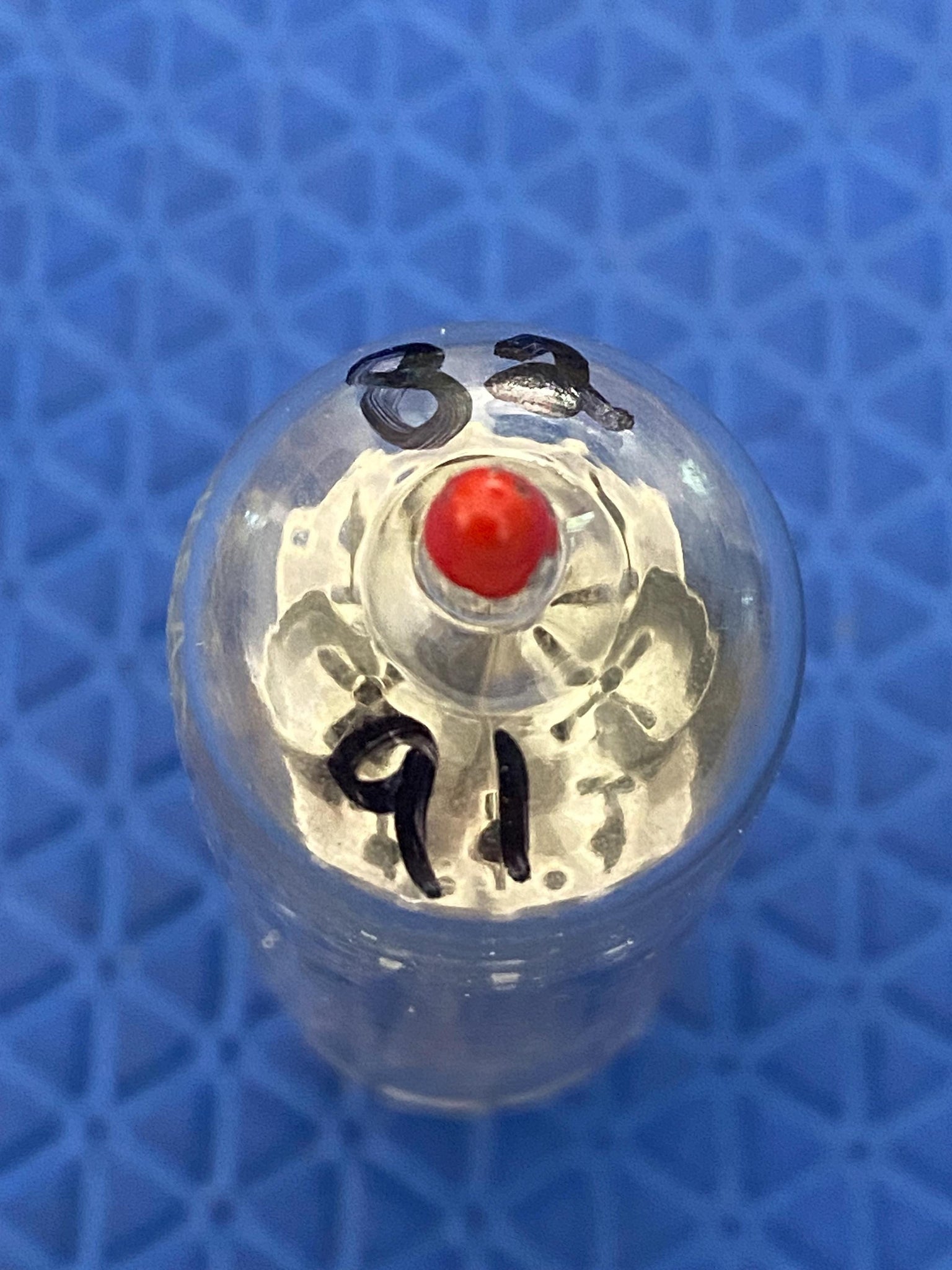 This tube has steel support rods; a side-D; a clear top with red paint (indicating it is a selected, low-noise tube; gray plates and excellent flashing. There is a shield between the triodes for reduced cross talk.