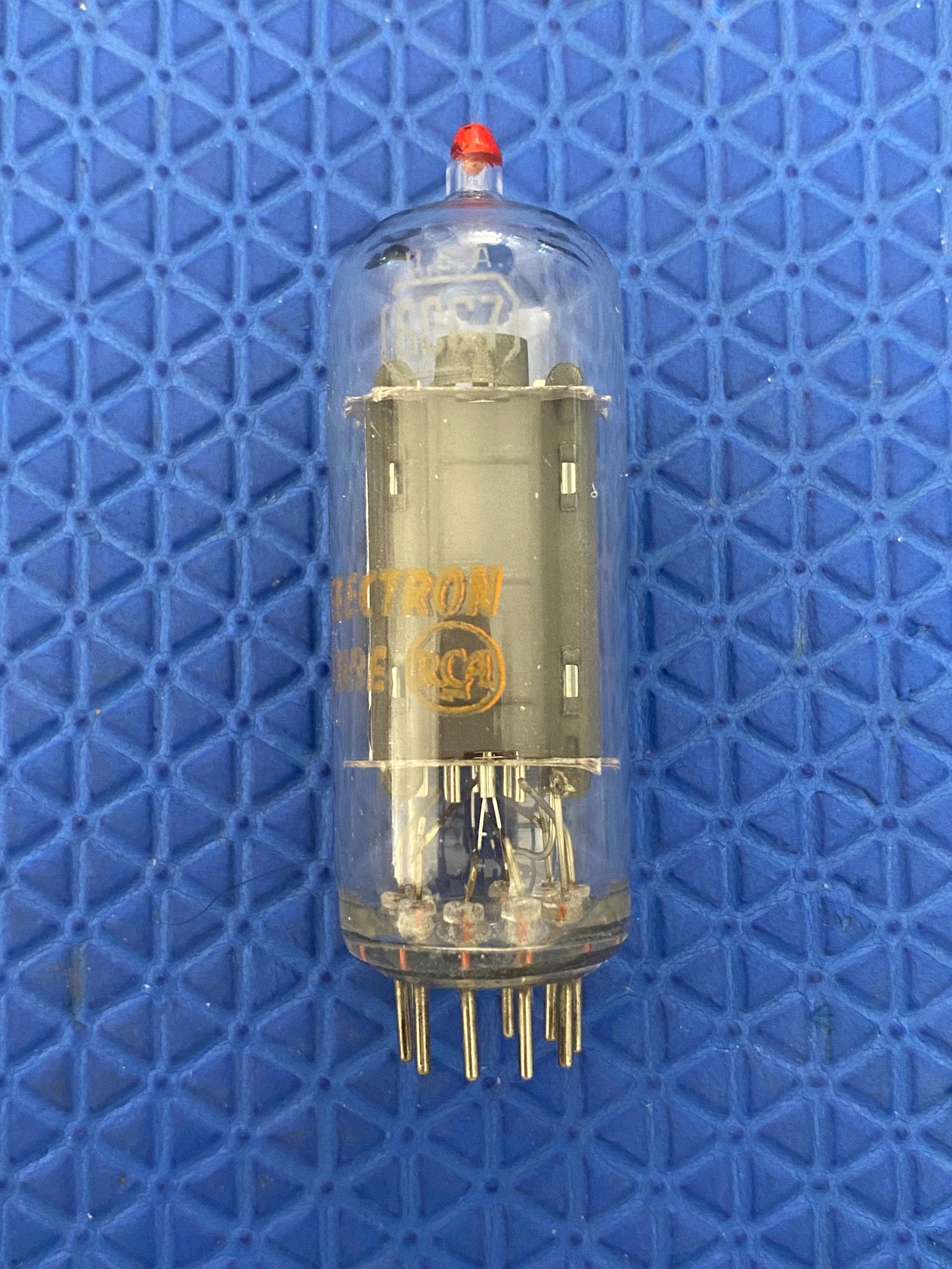 This new old stock-testing RCA clear top, red tip (low noise) 6CG7 / 6FQ7 dual triode was tested on our Paul Hart-calibrated TV7/U for shorts, gas and transconductance. There were no shorts or gas.