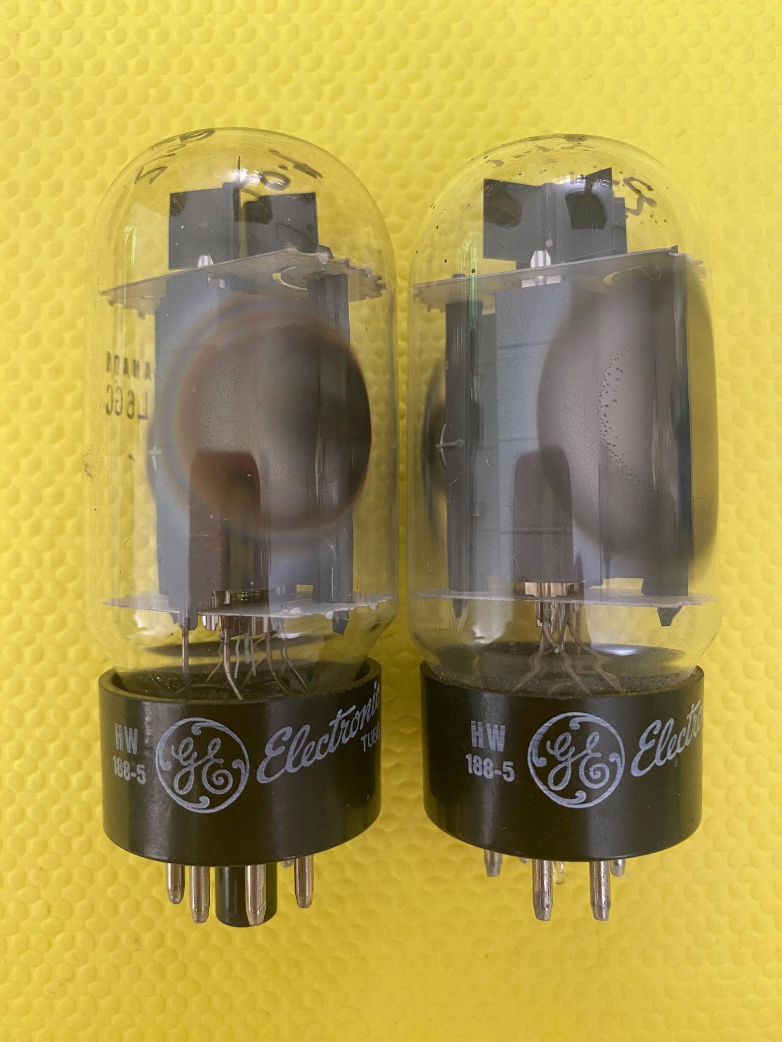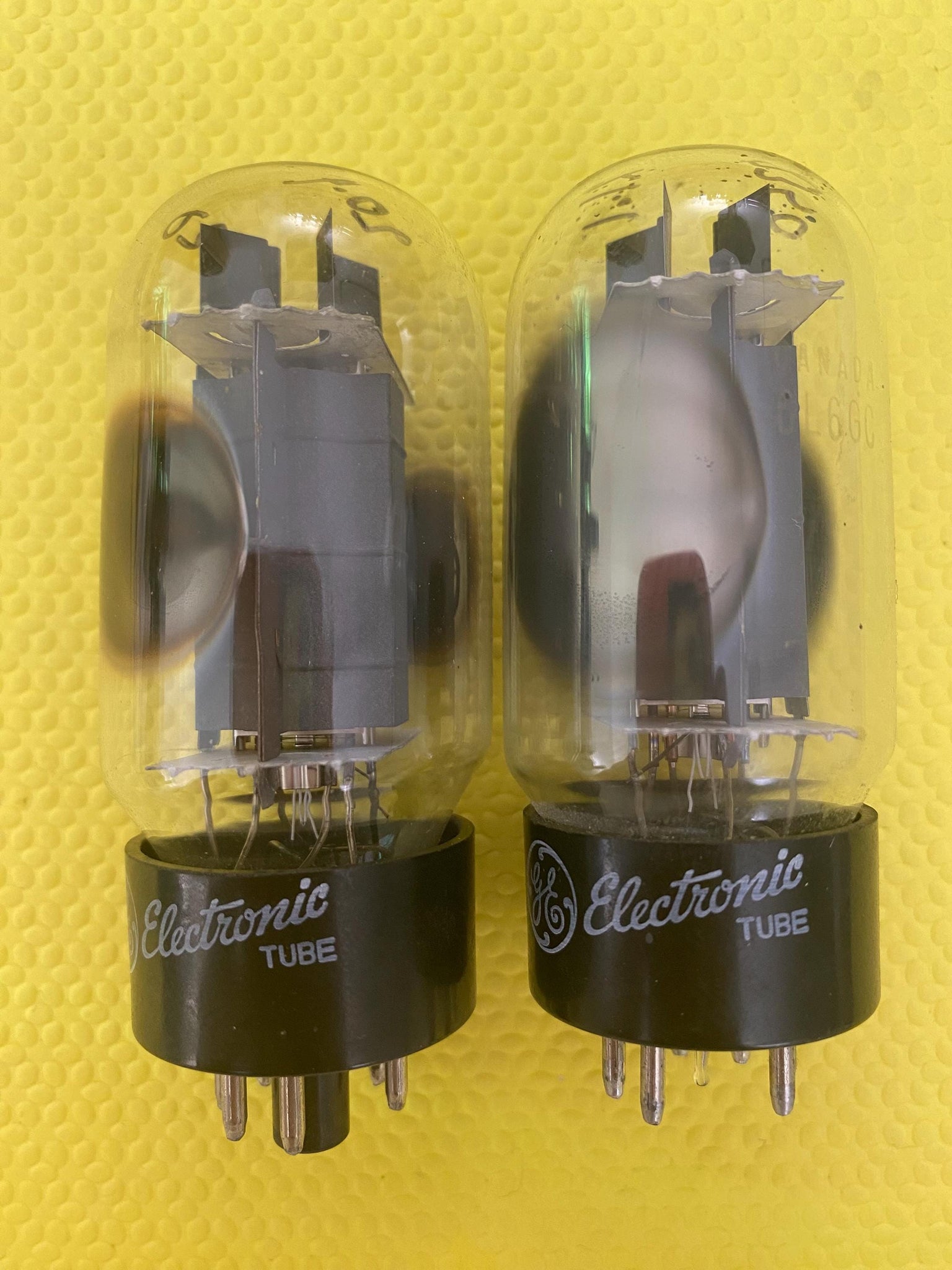 This matched pair of Canadian GE 6L6GC output tubes was tested on our Maxi-Matcher with 400 volts on the plates and a bias of -48 volts for shorts, gas and transconductance. There were no shorts or gas and they tested as follows:
