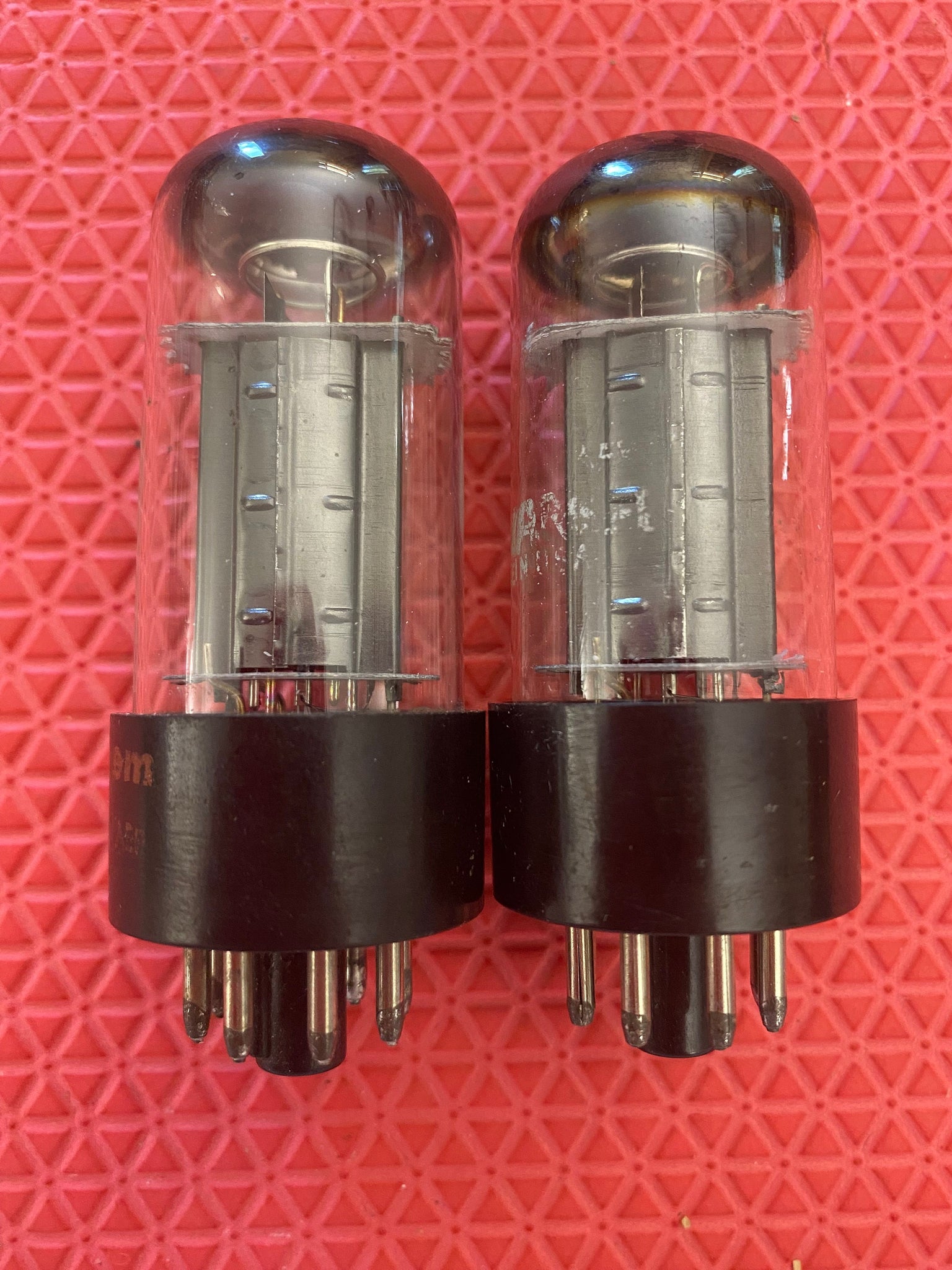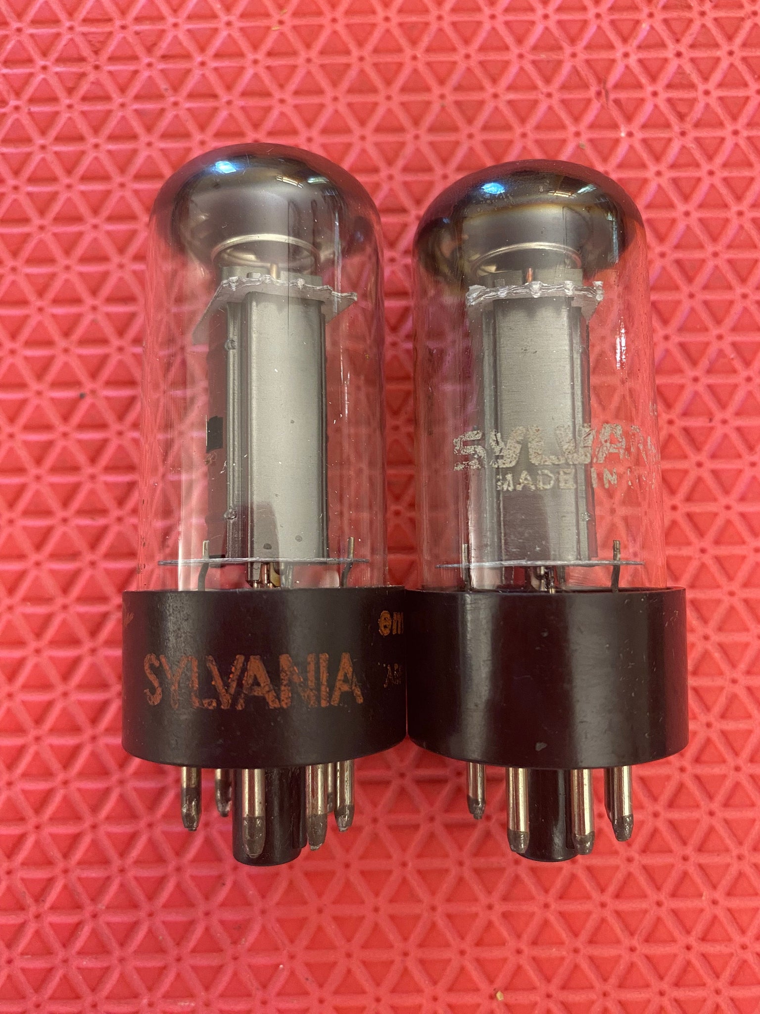 This new old stock-testing matched pair of silver top Sylvania 6V6GTA output tubes was tested on our Maxi-Matcher 2 for shorts, gas and transconductance. There were no shorts or gas.