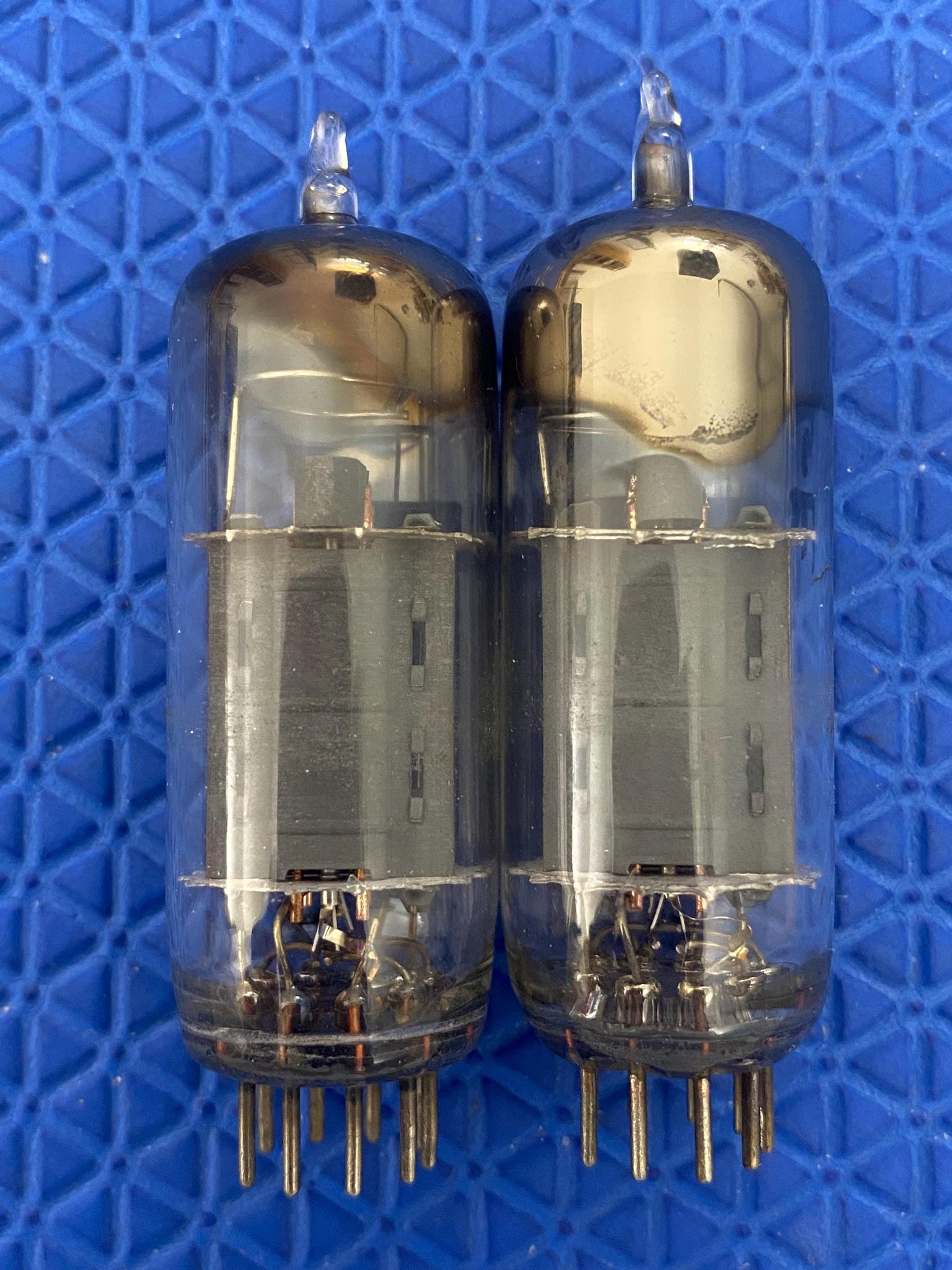 This new old stock-testing matched pair of GE 12BH7A dual triodes was tested on our Paul Hart-calibrated TV7/U for shorts, gas and transconductance. There were no shorts or gas.