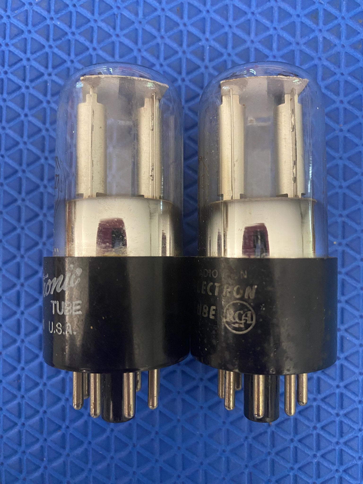 Transconductance measured 38/41 for Tube One and 42/41 for Tube Two (RCA-LABELED) where minimum (65%) is 32/32.