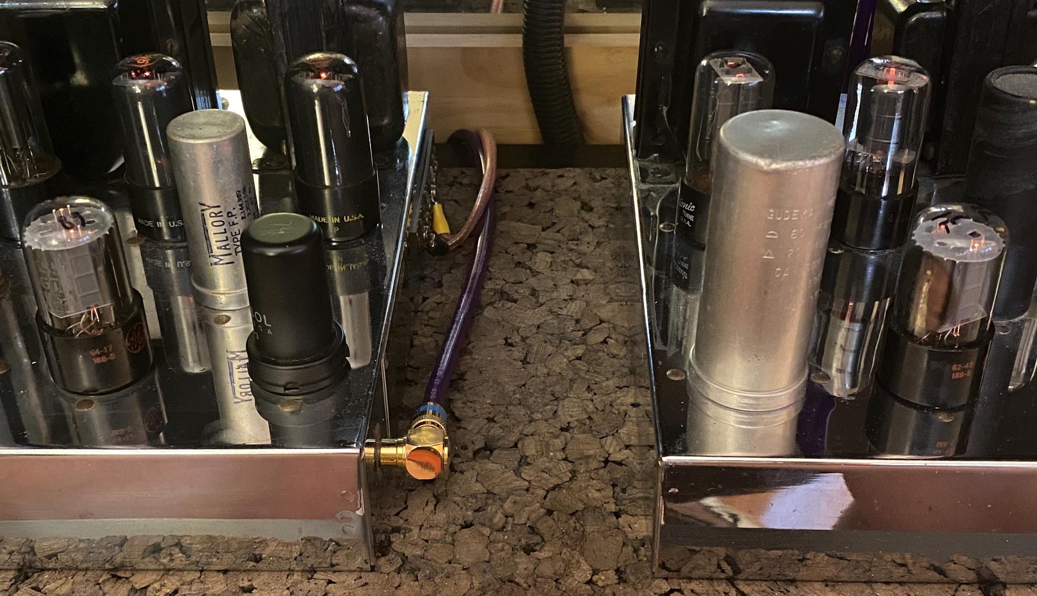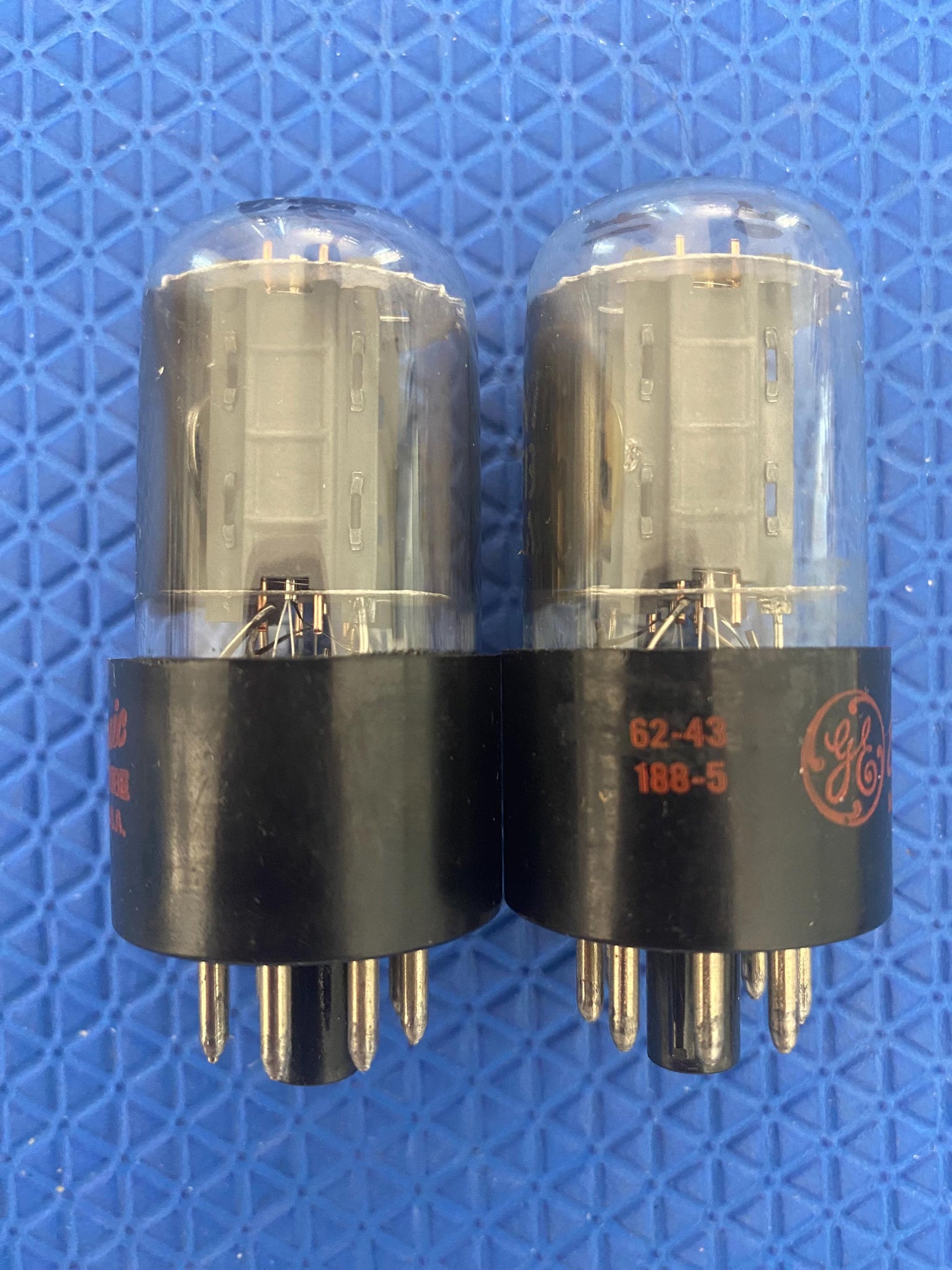 They have side O getters; 64-17 188-5 and 62-43 188-5 date/provenance codes, respectively; copper support rods; a round and square hole in each mica spacer and great flashing.