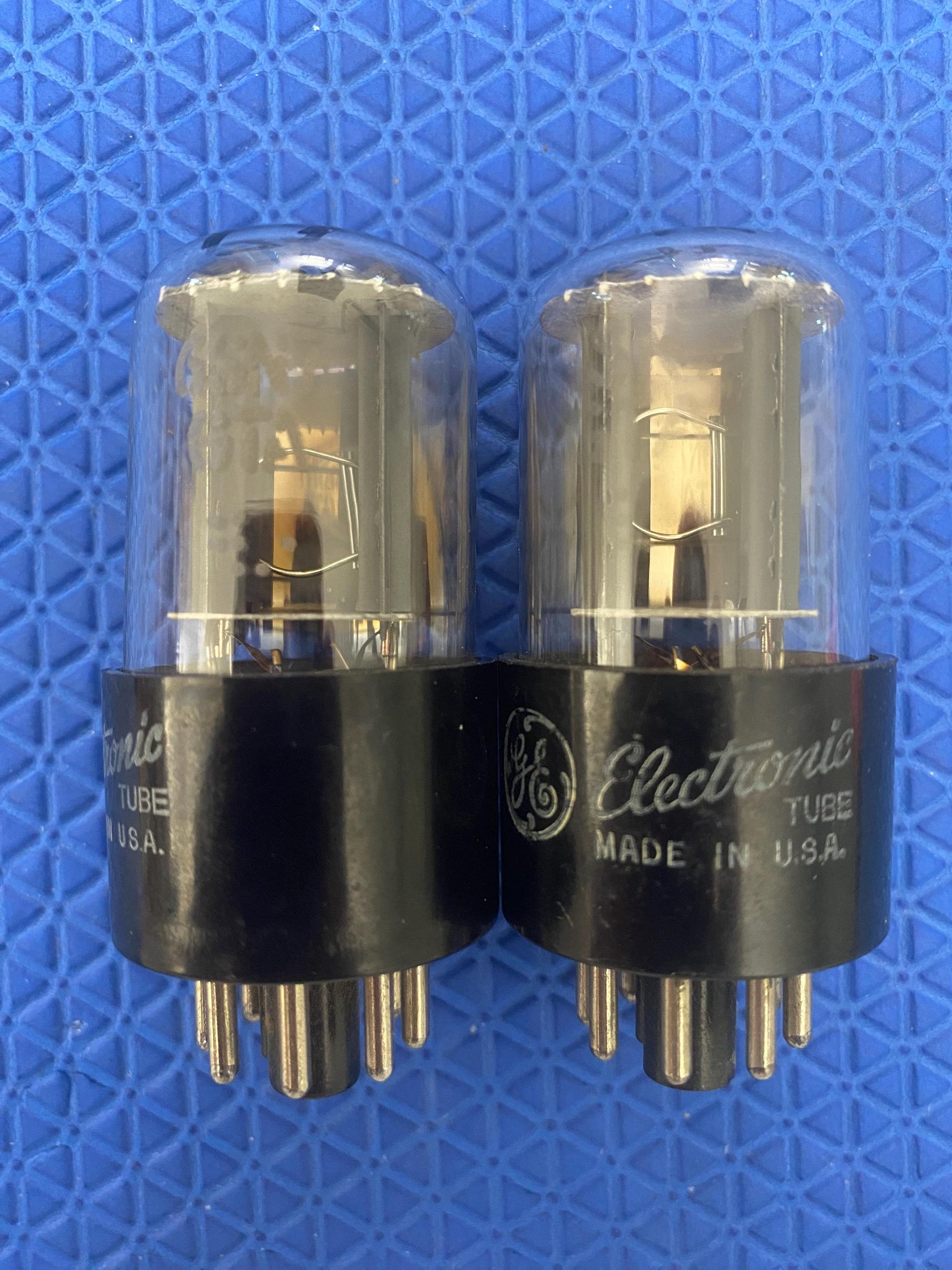 This new old stock-testing matched pair of GE 6SN7GTA dual triodes was tested on our Paul Hart-calibrated TV7/U for shorts, gas and transconductance. There were no shorts or gas.
