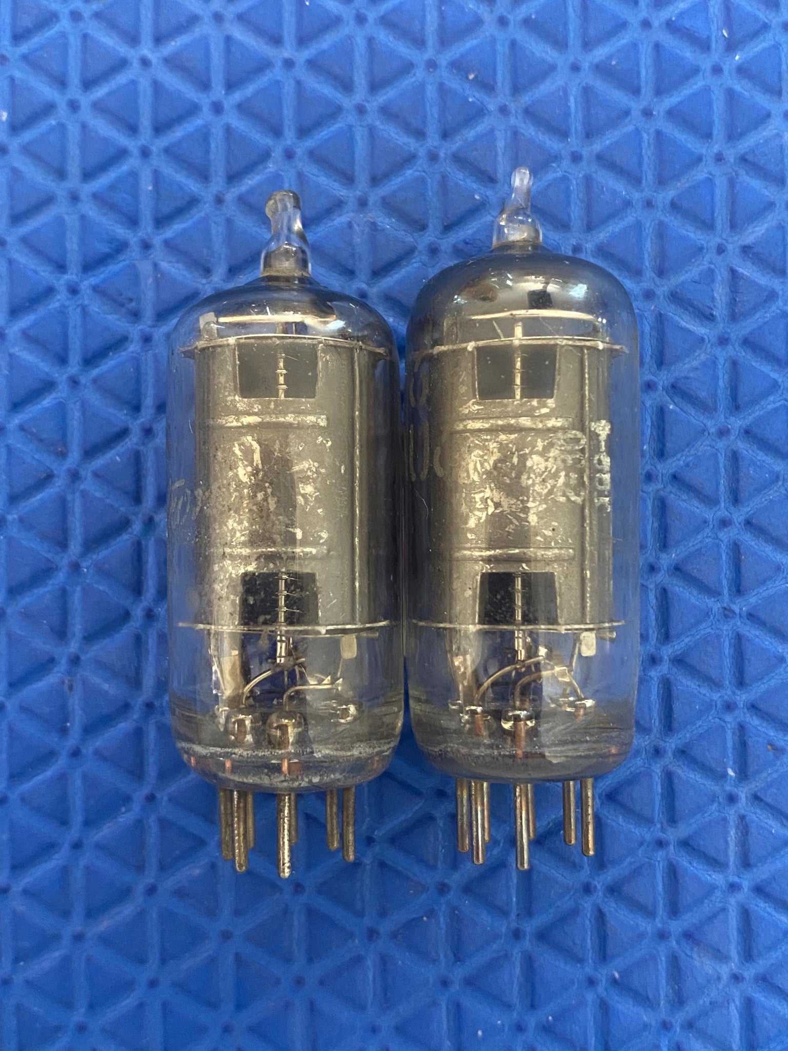 This matched pair of GE nickel plate 6AU6 tubes was tested on our Paul Hart-calibrated TV7/U for shorts, gas and transconductance. There were no shorts or gas.