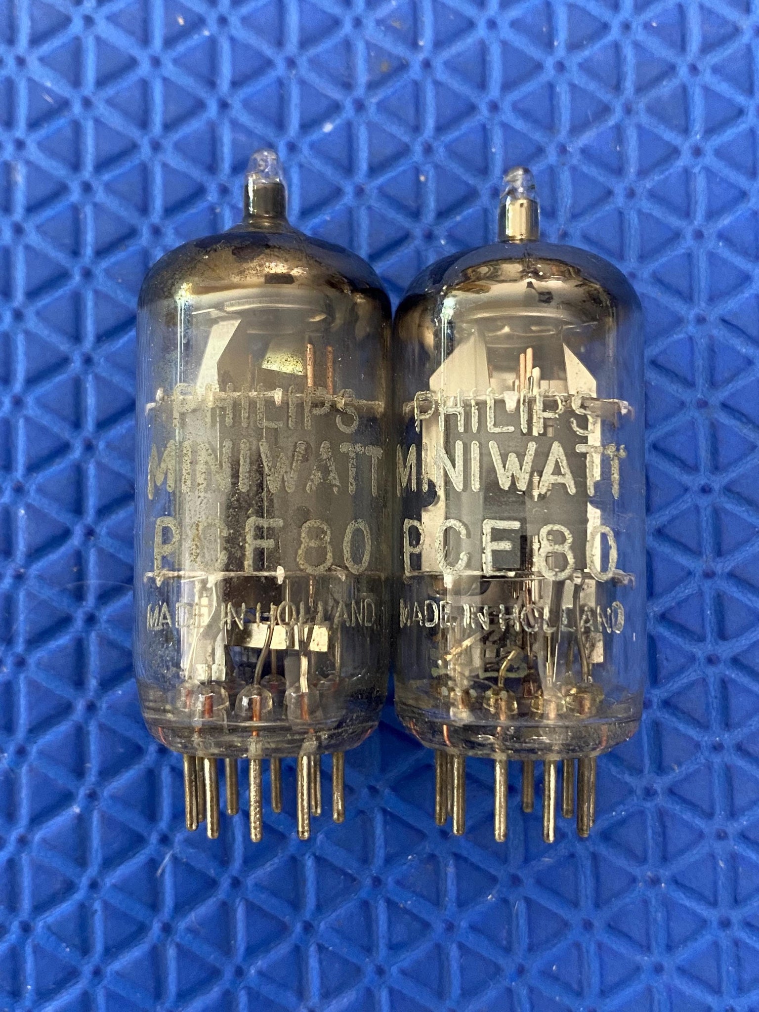 This matched pair of Philips Miniwatt PCF80 / 9U8 tubes was tested on our Paul Hart-calibrated TV7 for shorts, gas and transconductance. There were no shorts or gas.