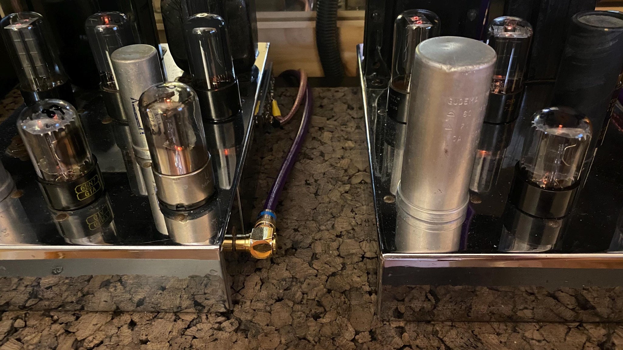 This matched pair of Raytheon 6SN7GTA dual triodes was tested on our Paul Hart-calibrated TV7/U for shorts, gas and transconductance. There were no shorts or gas.