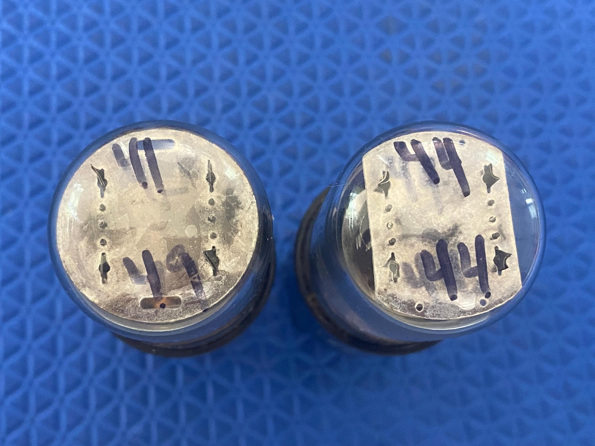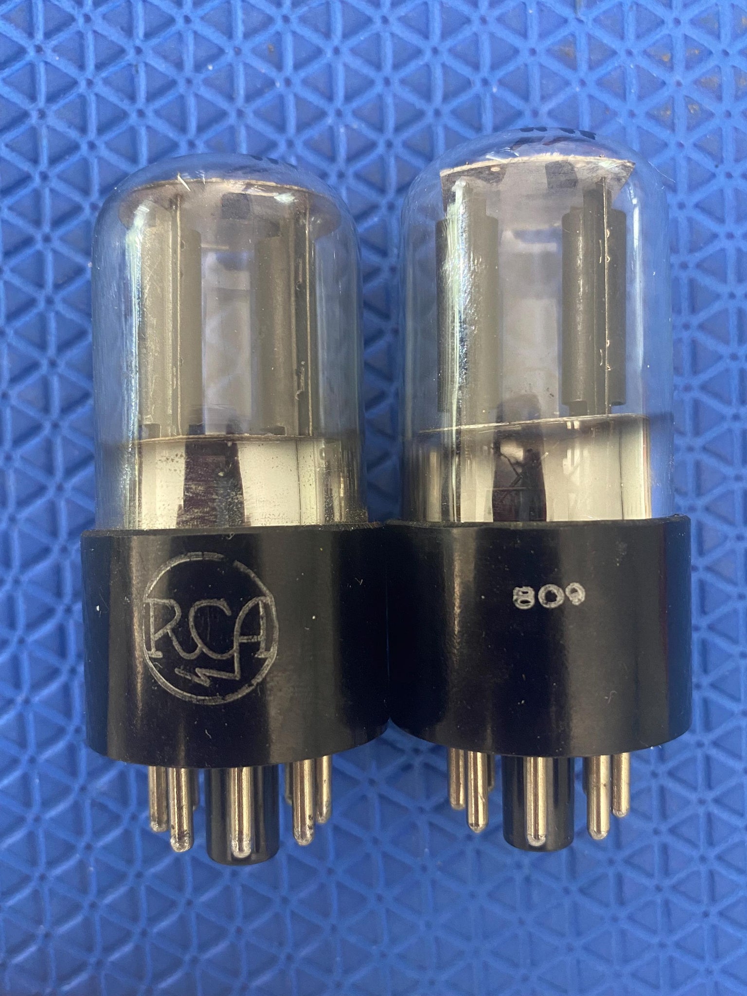 These tubes have excellent flashing; dark, gray plates and bottom, dimpled-sheet getters. Both tubes were made in the same factory just as RCA bought out Cunningham. They are exactly-the-same on the inside with the exception of the top mica spacers.