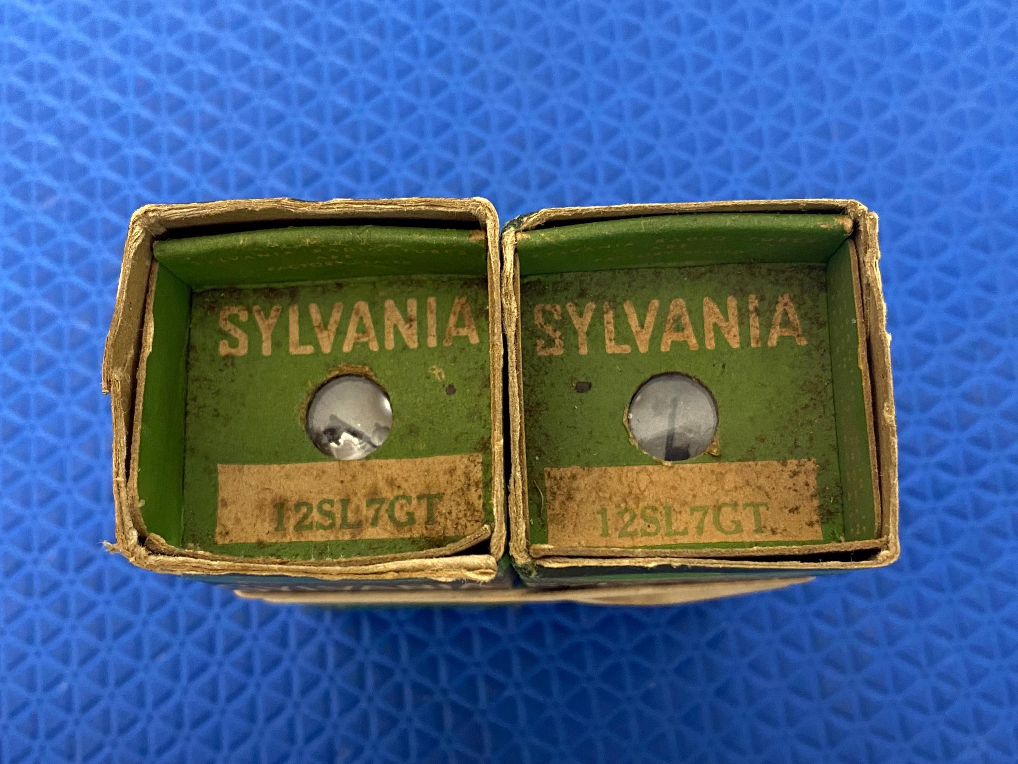 This new old stock, new in box matched pair of Sylvania 12SL7 / 12SL7GT dual triodes was tested on our Pau Hart-calibrated TV7/U for shorts, gas and transconductance. There were no shorts or gas.