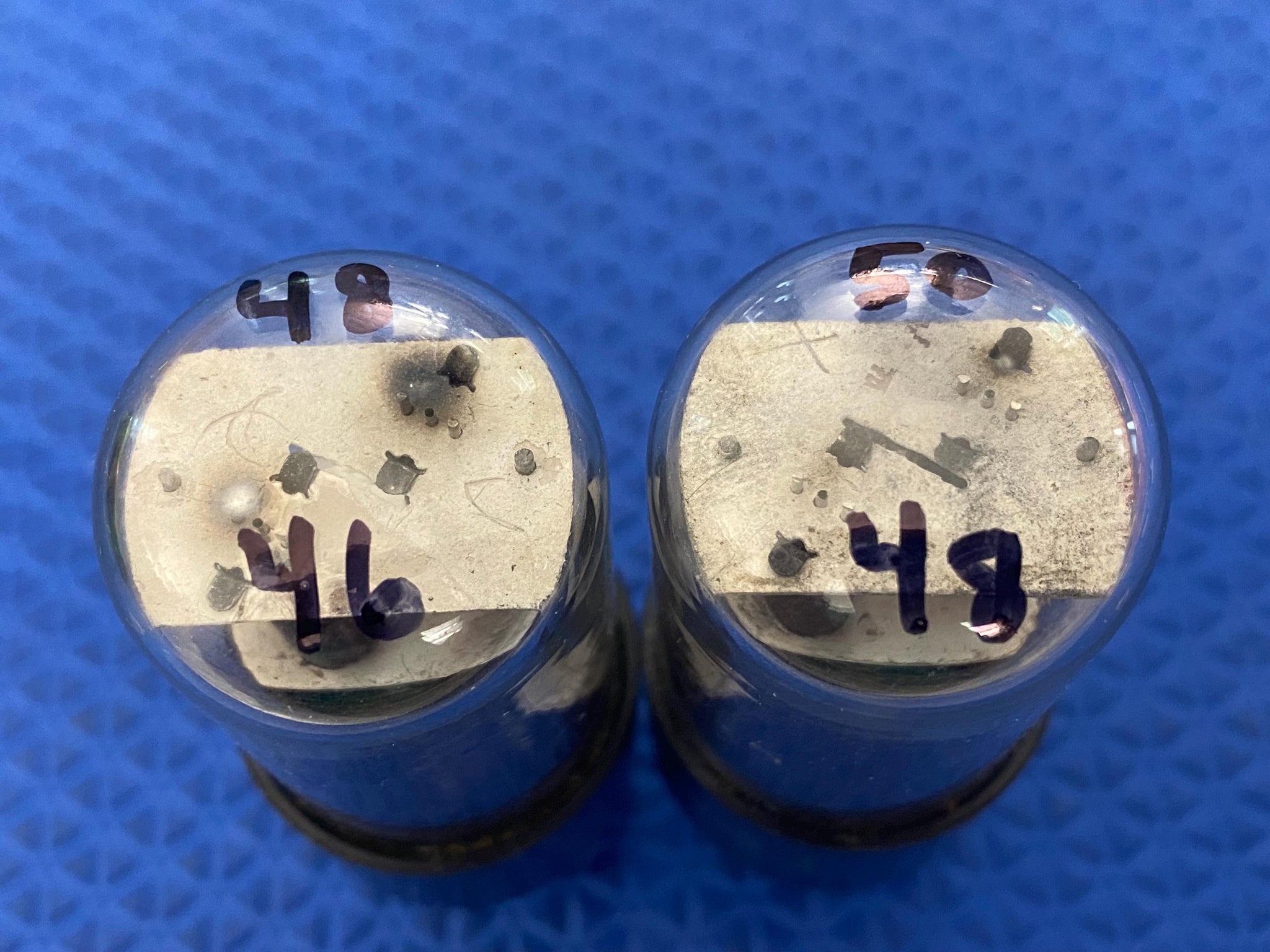 These tubes have beautiful flashing; matte, dark-gray plates and side, dimpled-sheet getters. Both were made during World War Two with M-R V4R codes.
