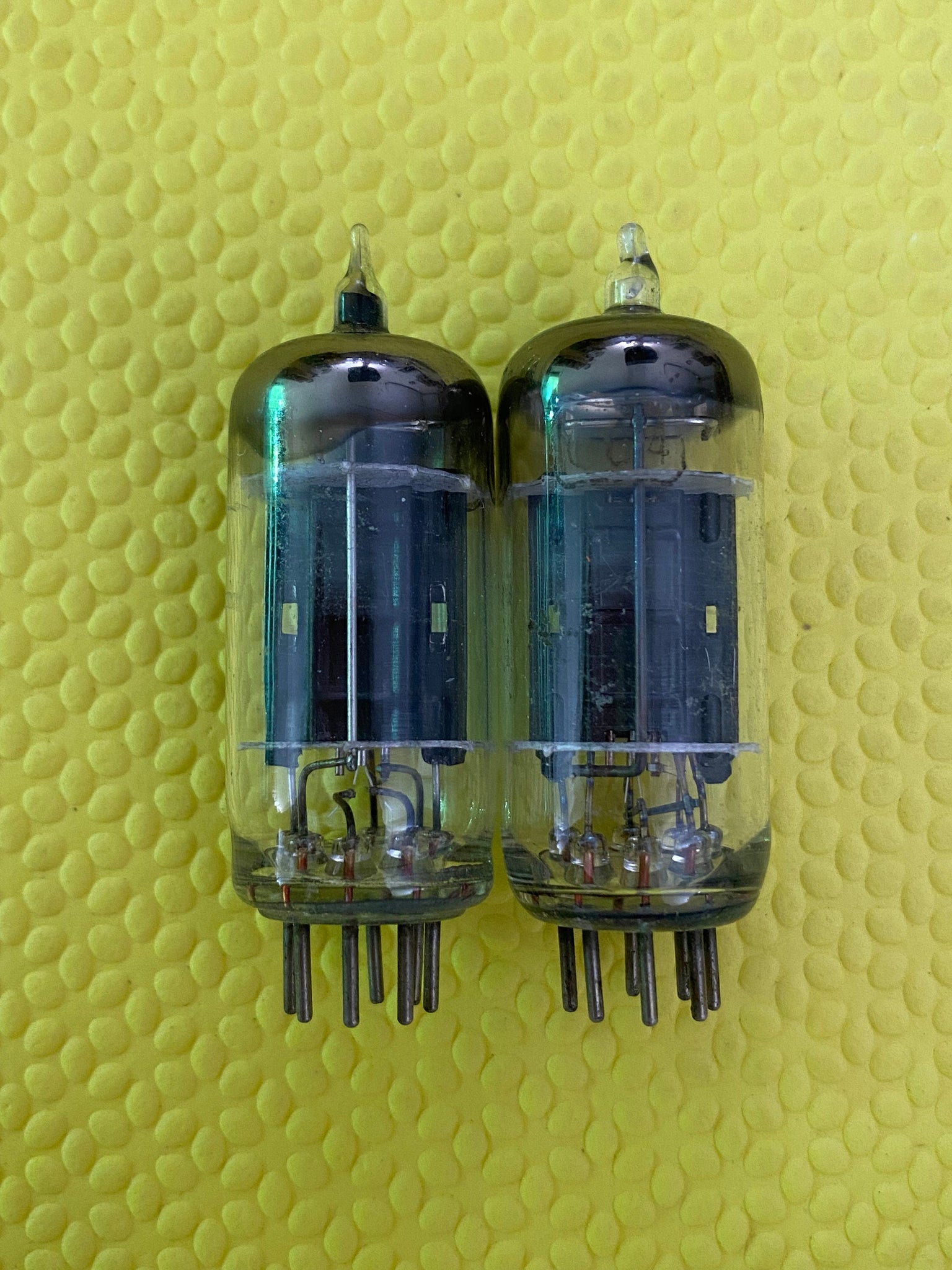 This almost-perfectly-matched pair of Sylvania black plate 6C4 triodes was tested on our Paul Hart-calibrated TV7/U for shorts, gas and transconductance. There were no shorts or gas.
