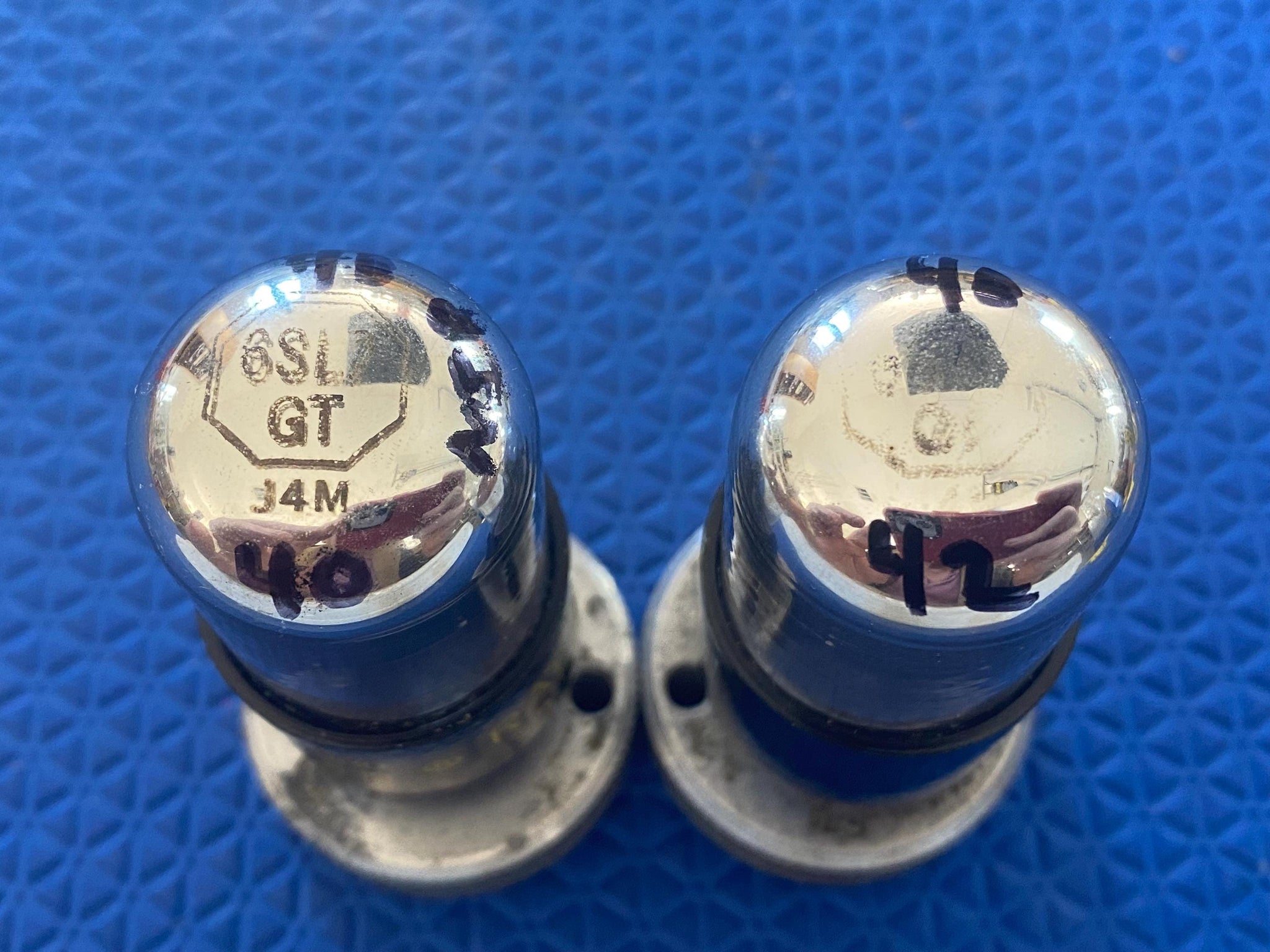 This new old stock, new in box (For Tube One) matched pair of vintage Sylvania-MANUFACTURED 6SL7GT dual triodes was tested on our Paul Hart-calibrated TV7/U for shorts, gas and transconductance. There were no shorts or gas.