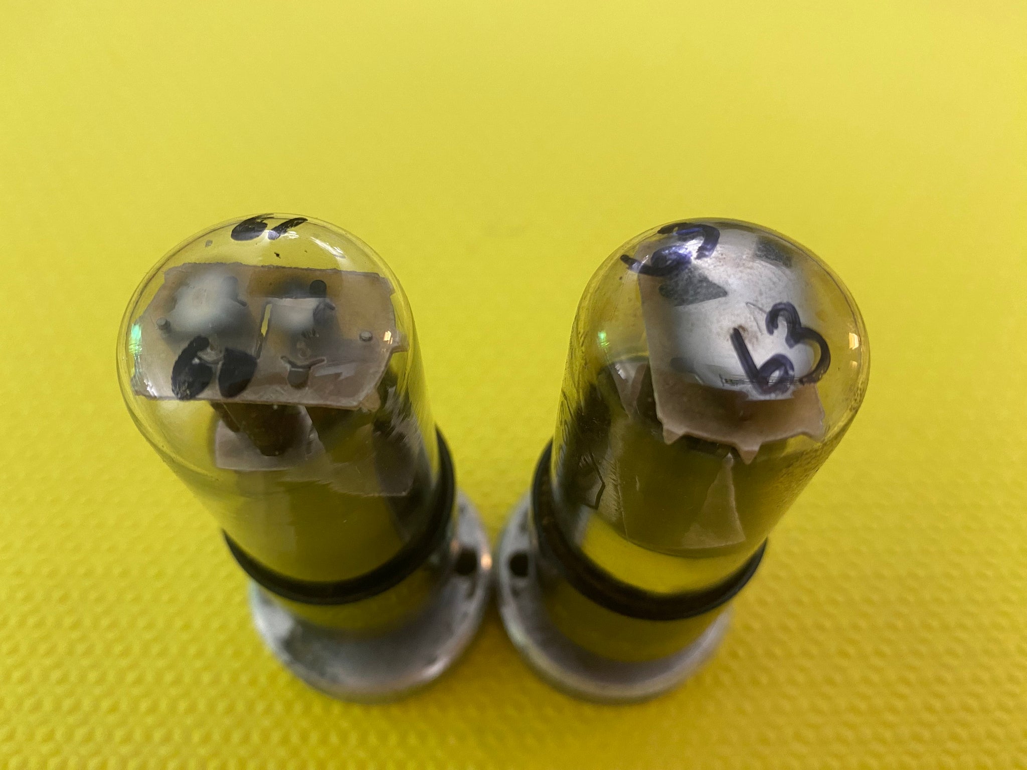 Both tubes have matte black, two-hole T plates; dimple sheet getters; crenelated, rectangular top mica spacers with chevrons and smooth-sided, rectangular bottom mica spacers; steel support rods and terrific Sylvania flashing. They have 952 and 926 date codes, respectively. Tube Two has a 312 Sylvania provenance code while Tube One does not. Tube Two has two hairline cracks, but the bottle is nonetheless firmly attached and cannot be wiggled.