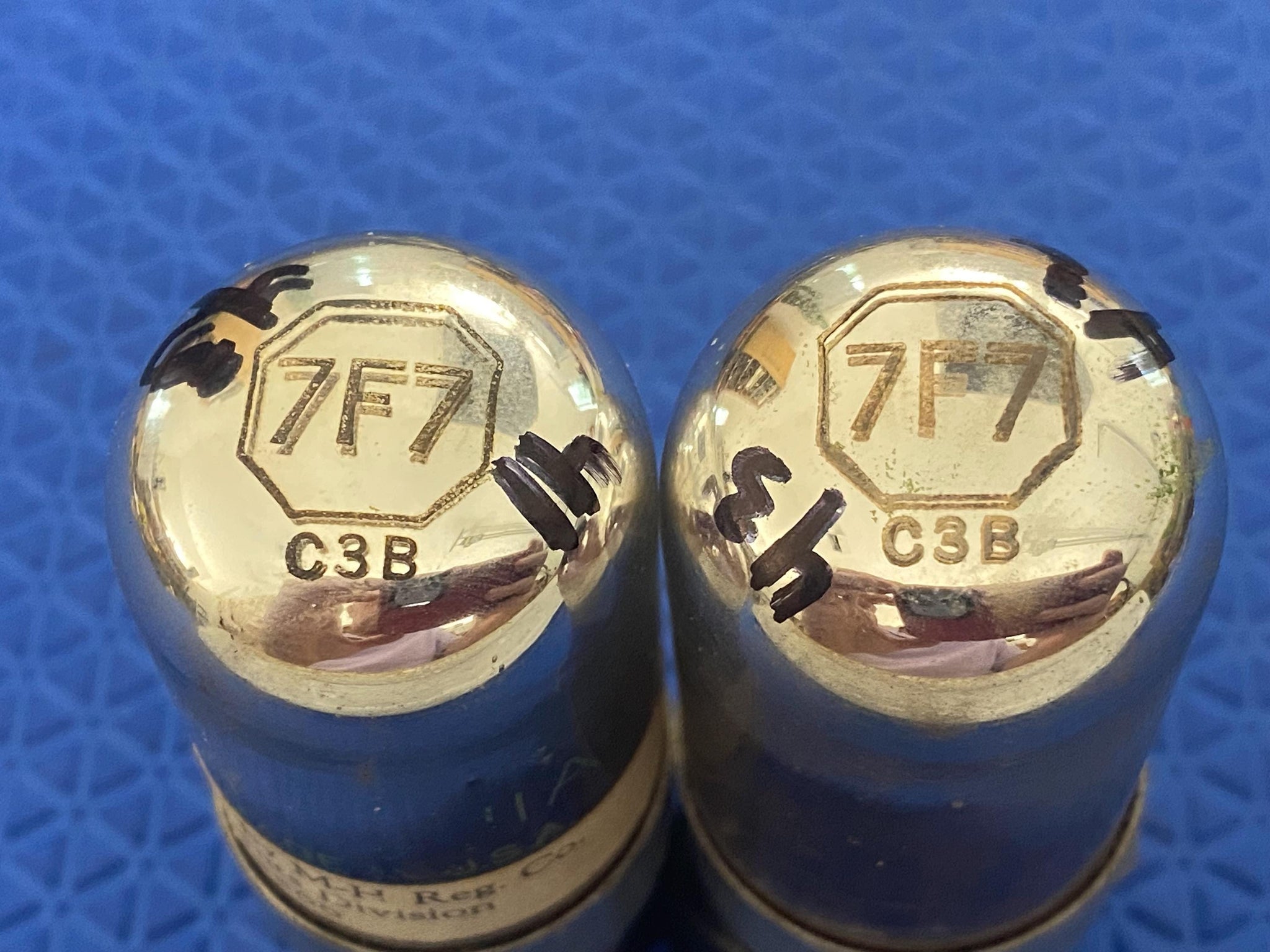 This new old stock-testing matched pair of Sylvania 7F7 dual triodes was tested on our Paul Hart-calibrated TV7/U for shorts, gas and transconductance. There were no shorts or gas.