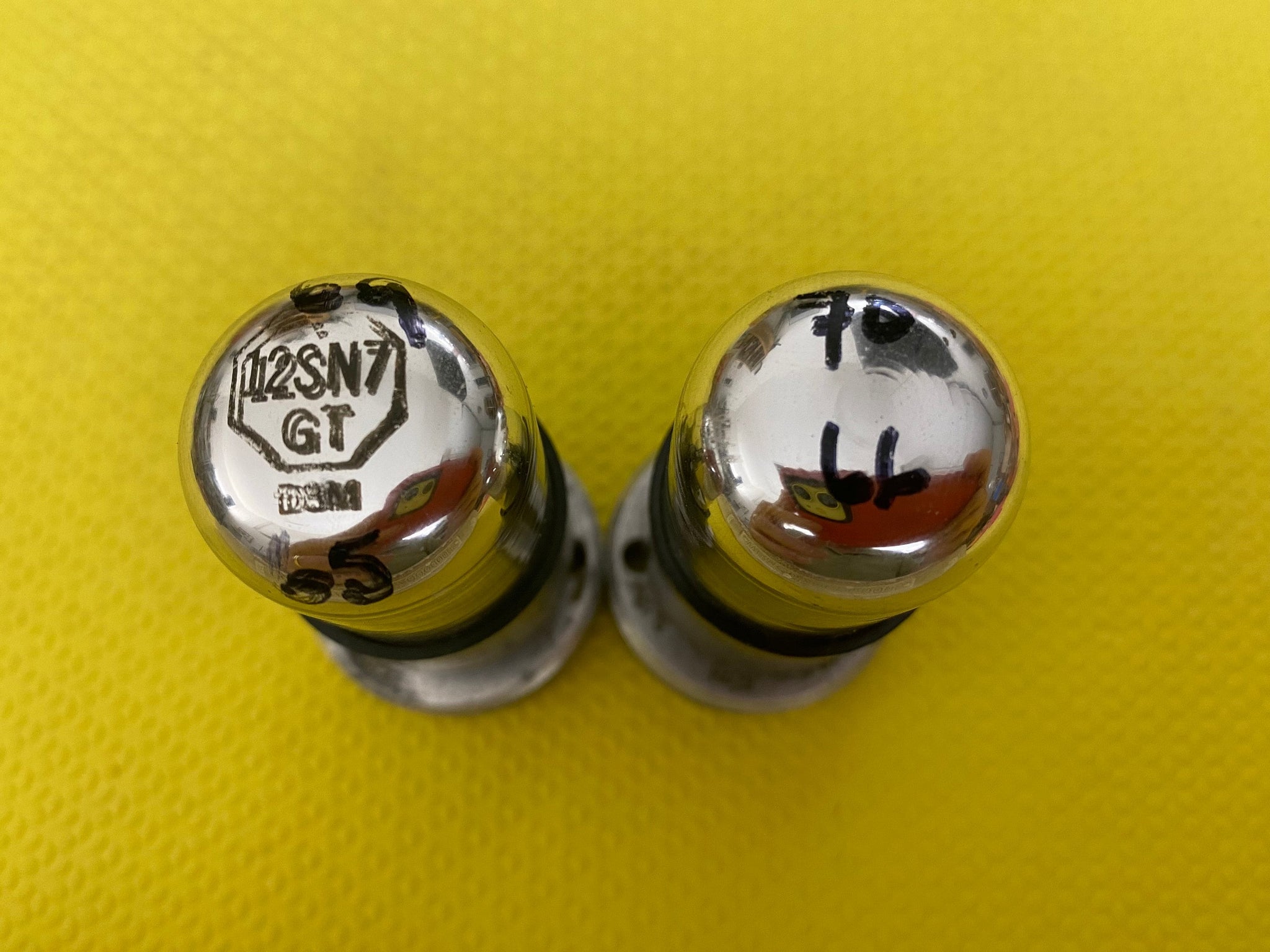 This matched pair of Sylvania Bad Boy-style (three plate holes per triode) 12SN7GT dual triodes was tested on our Paul Hart-calibrated TV7/U for shorts, gas and transconductance. There were no shorts or gas.
