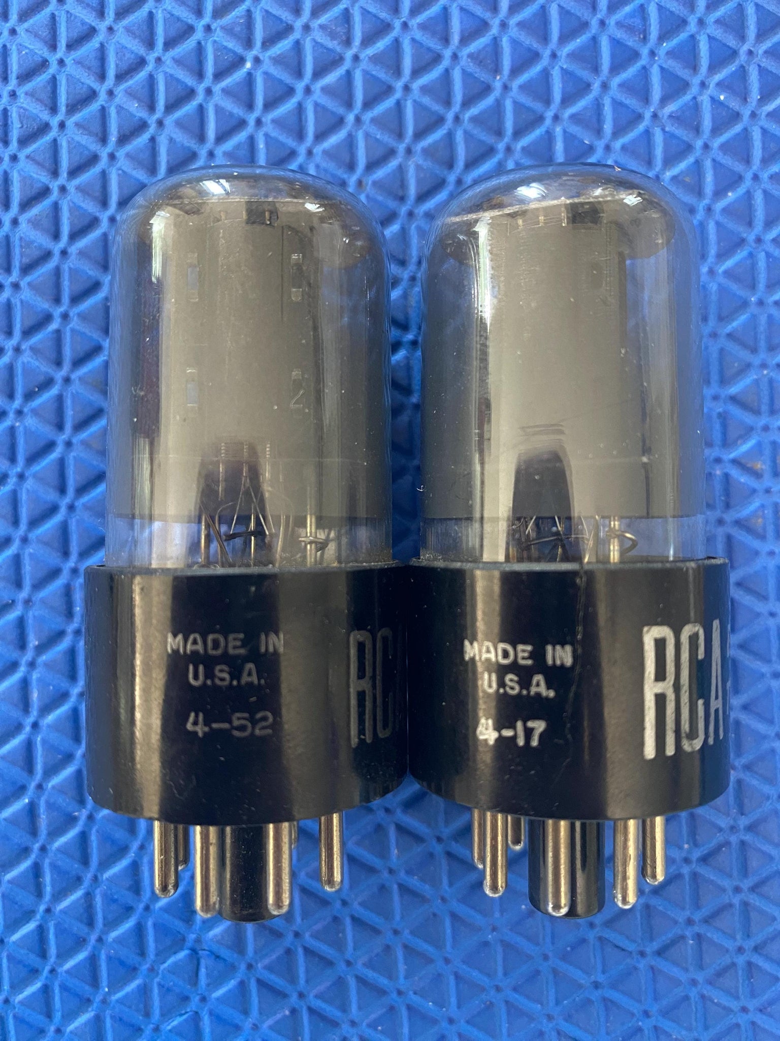 This new old stock, new in box (for Tube Two) aesthetically-matched pair of gray glass RCA 12SL7GT dual triodes was tested on our Paul Hart-calibrated TV7/U for shorts, gas and transconductance. There were no shorts or gas.