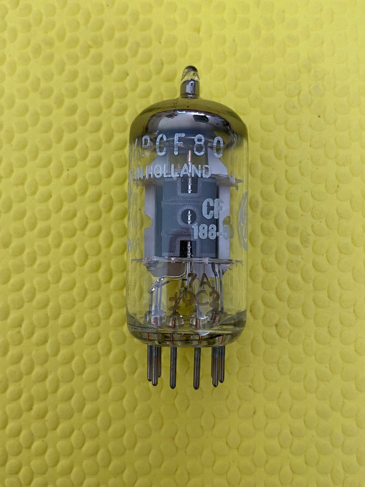 This new old stock, new in box Amperex-MANUFACTURED, GE-BRANDED 9A8 / PCF80 tube tested to spec on our Paul Hart-calibrated TV7/U. It was made in The Netherlands' province of Holland.