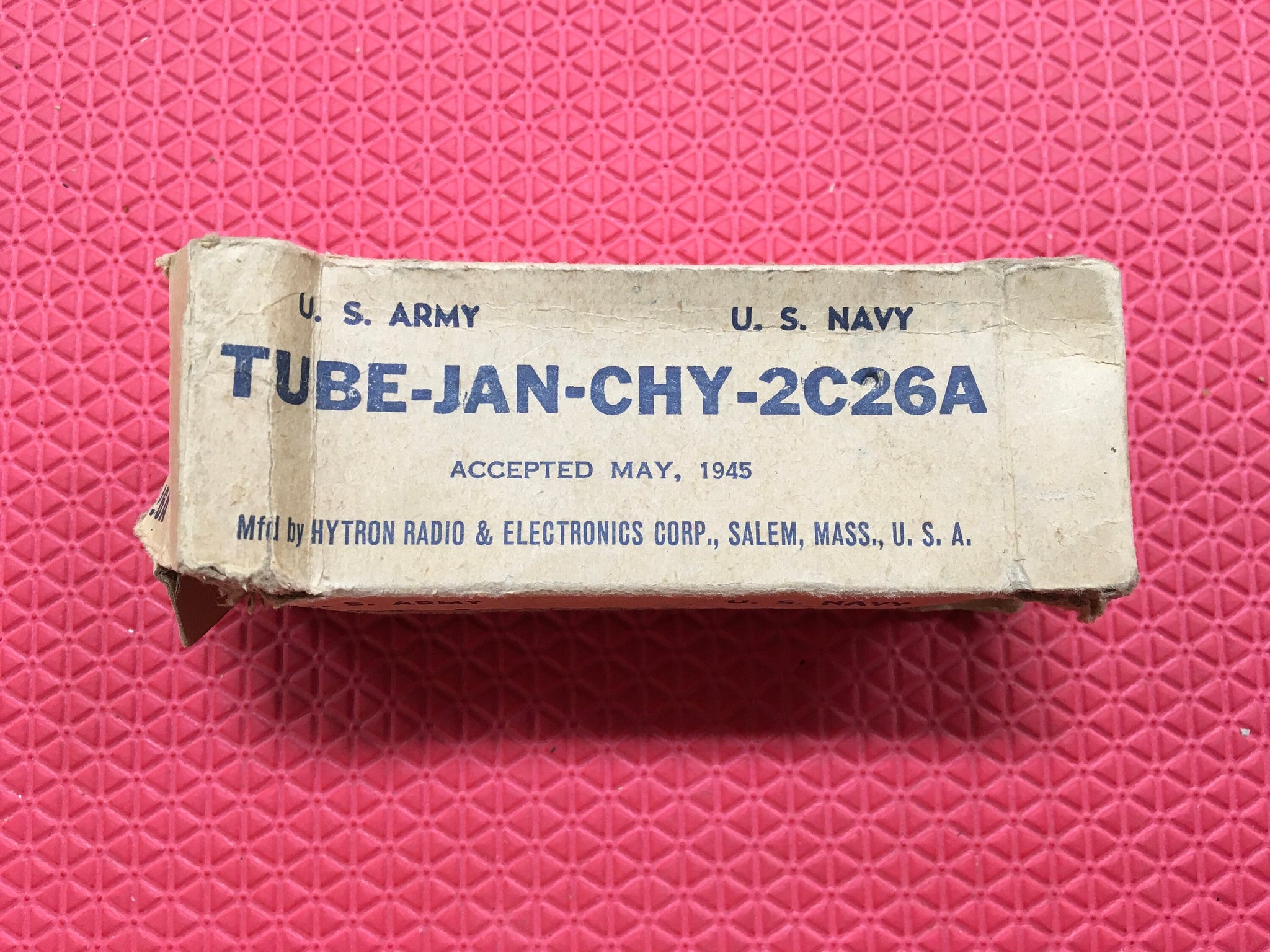 This new old stock, new in box milspec Hytron gray glass JAN-CHY-2C26A transmitting triode tested to spec on our Paul Hart-calibrated TV7/U.