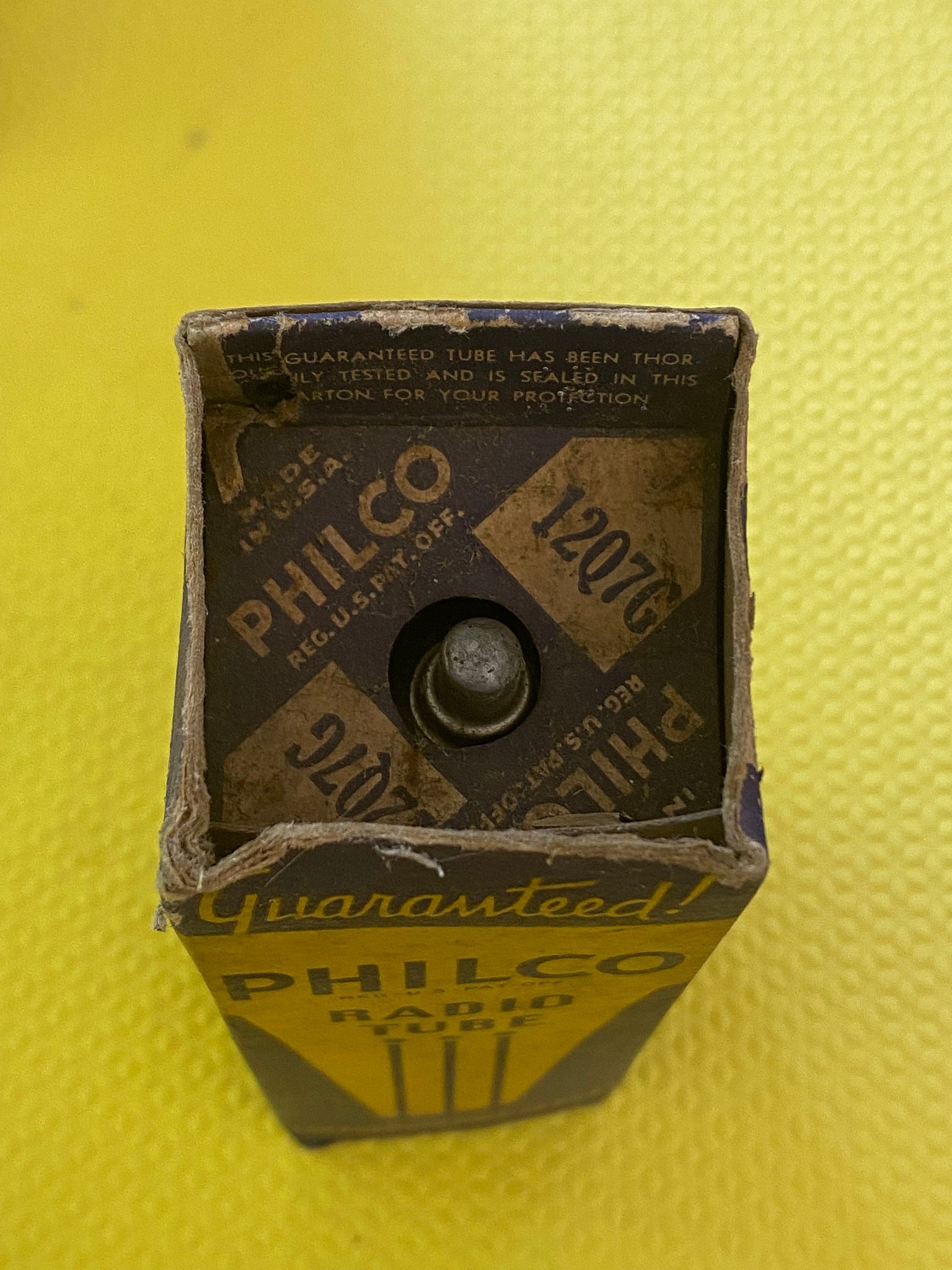 This new old stock, new in box Philco 12Q7 / 12Q7G tube tested to spec on our Paul Hart-calibrated TV7/U. This is an early model wtih the Coke bottle / shoulder design.