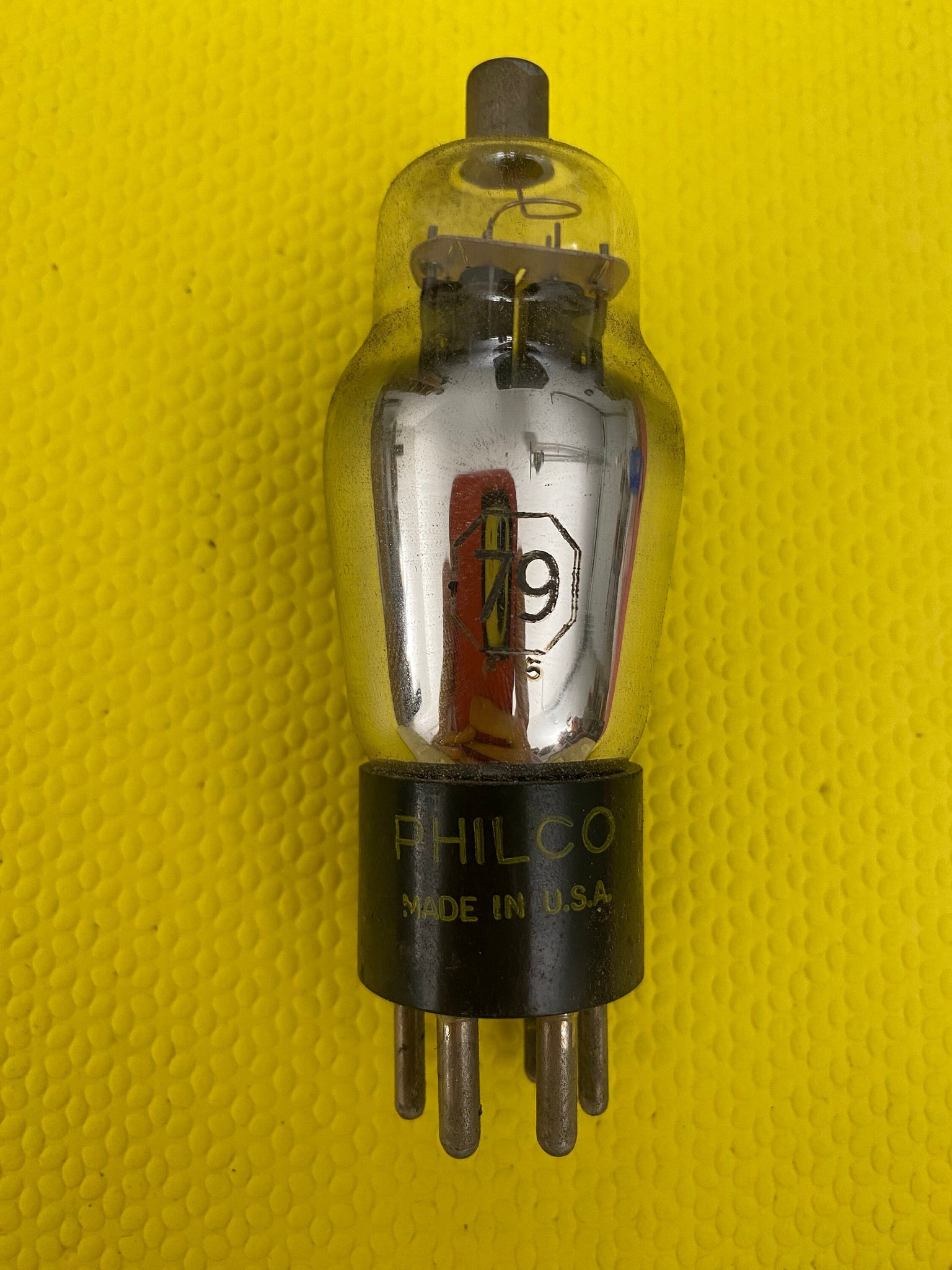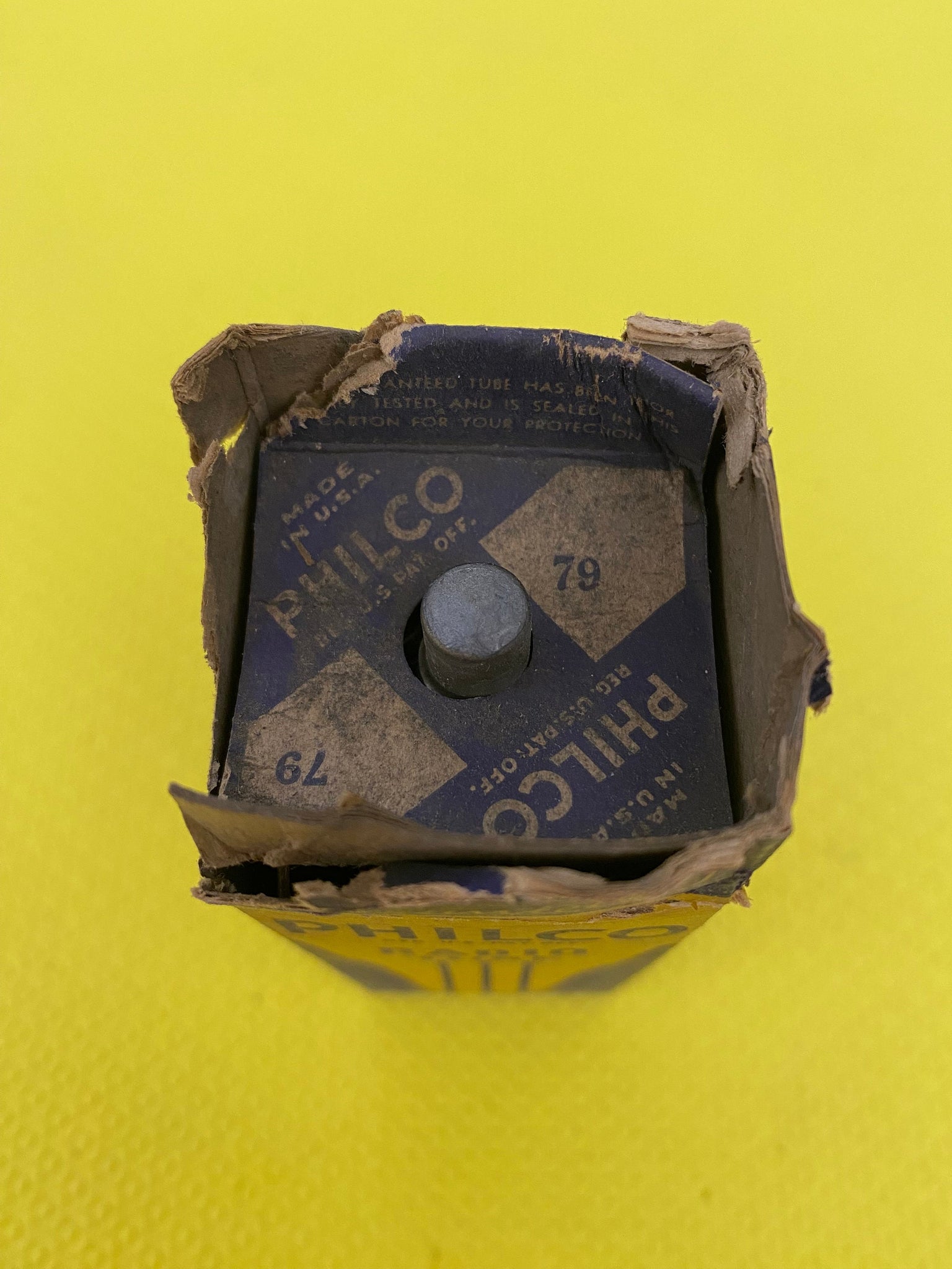This new old stock, new in box Philco type 79 tube tested to spec on our Paul Hart-calibrated TV7/U.