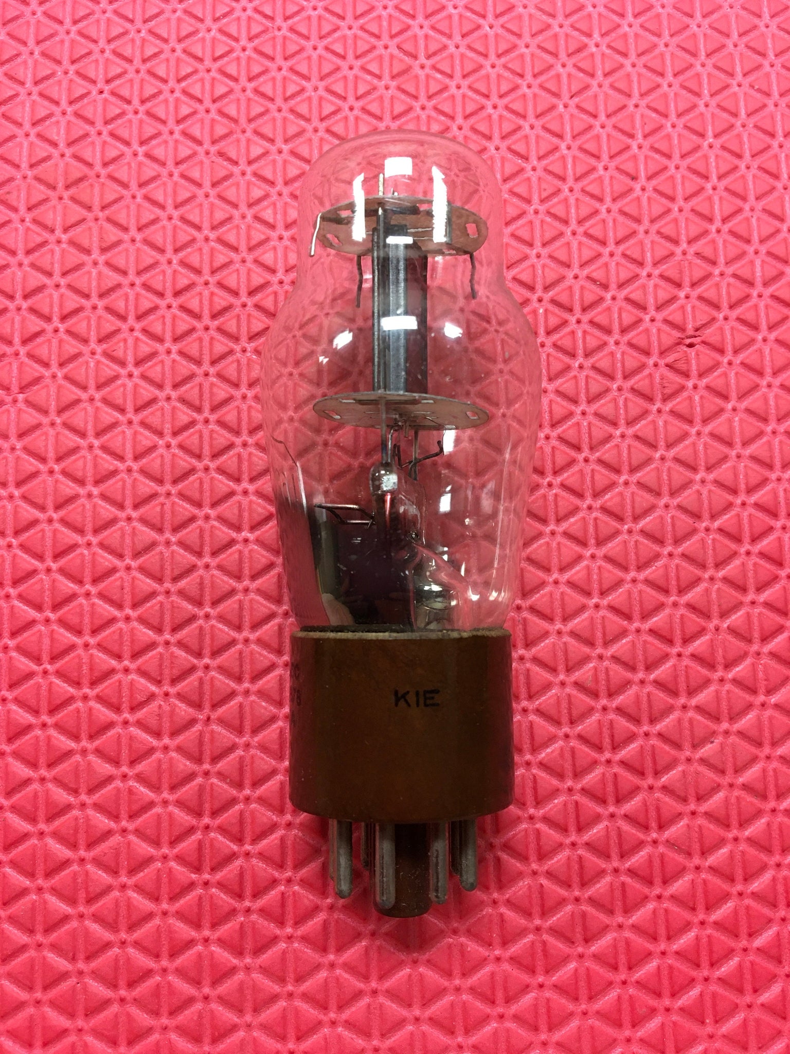 It has a micanol base; a large D getter; four steel snubbers for increased stability and lowered microphonics; US Army Signal Corps markings with a large RCA Meatball logo and a K1E date code.