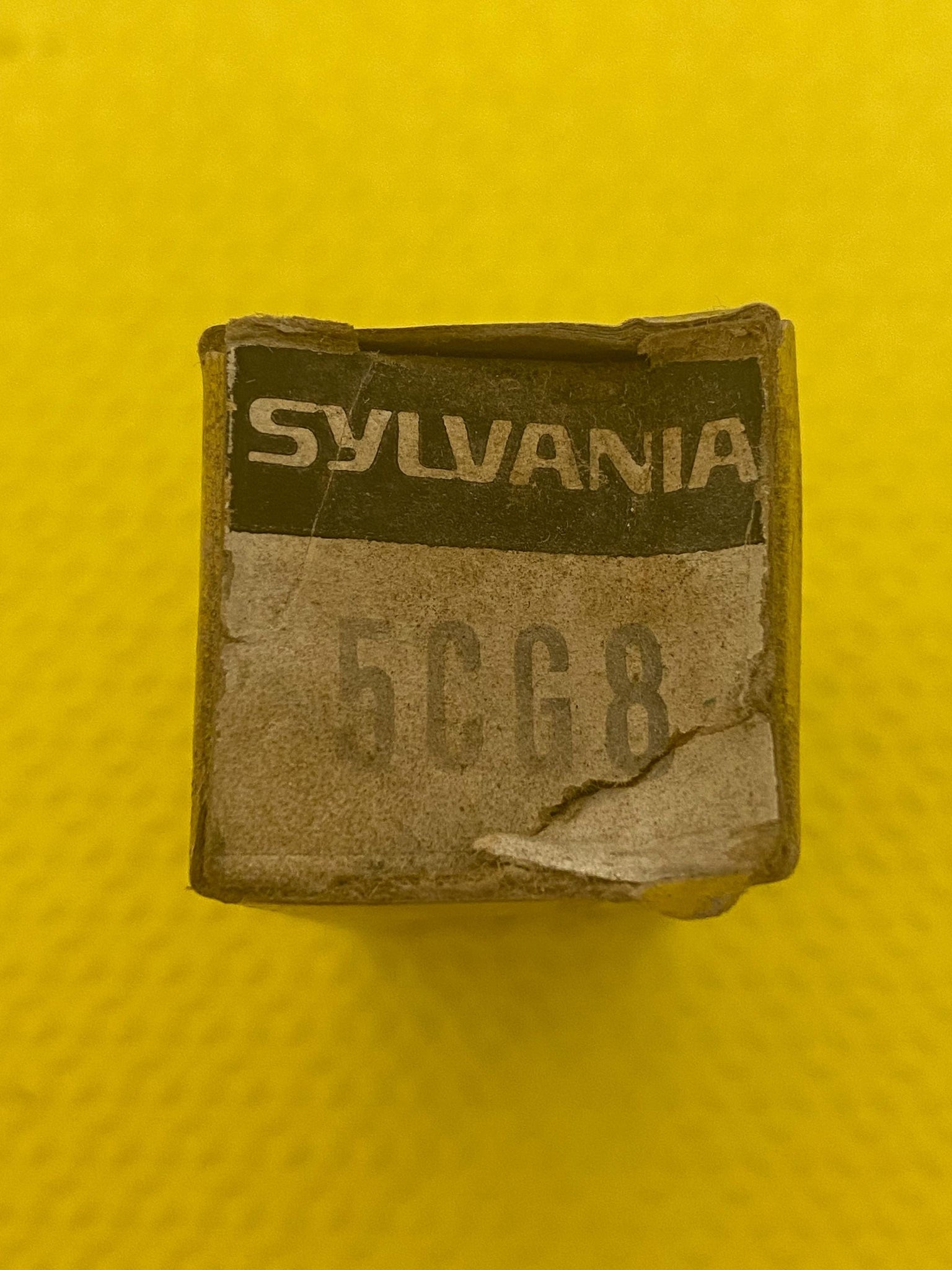 This Sylvania 5CG8 tube is new old stock, new in box and tested to spec on our Paul Hart-calibrated TV7/U.