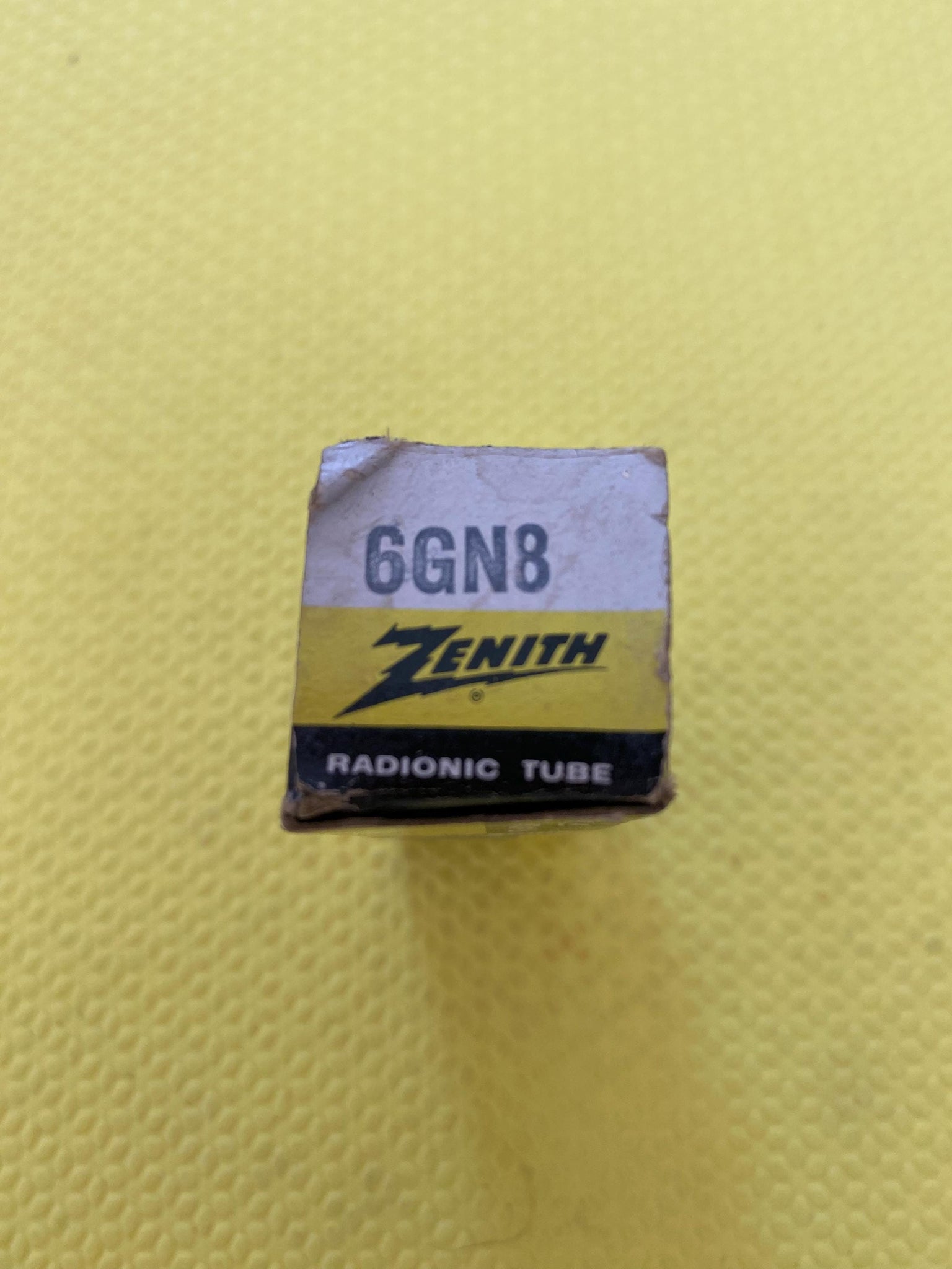 This new old stock, new in box Zenith 6GN8 tube tested to spec on our Paul Hart-calibrated TV7/U.
