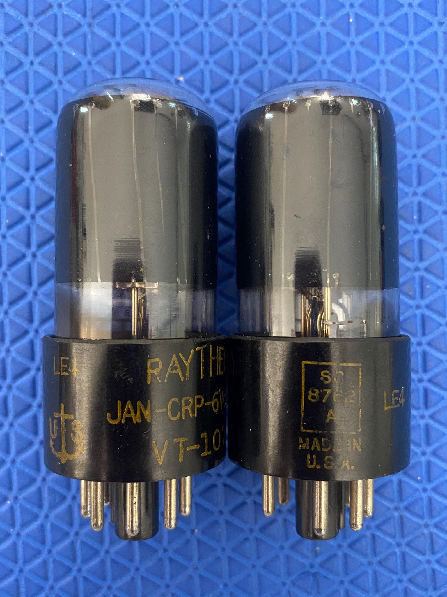This new old stock-testing matched pair of milspec Raytheon black glass VT-107-A / JAN-CRP-6V6-GT output tubes was tested on our Maxi-Matcher 2 with 400 volts on the plates and a bias of -36 volts for shorts, gas and transconductance. There were no shorts or gas and they test as follows: