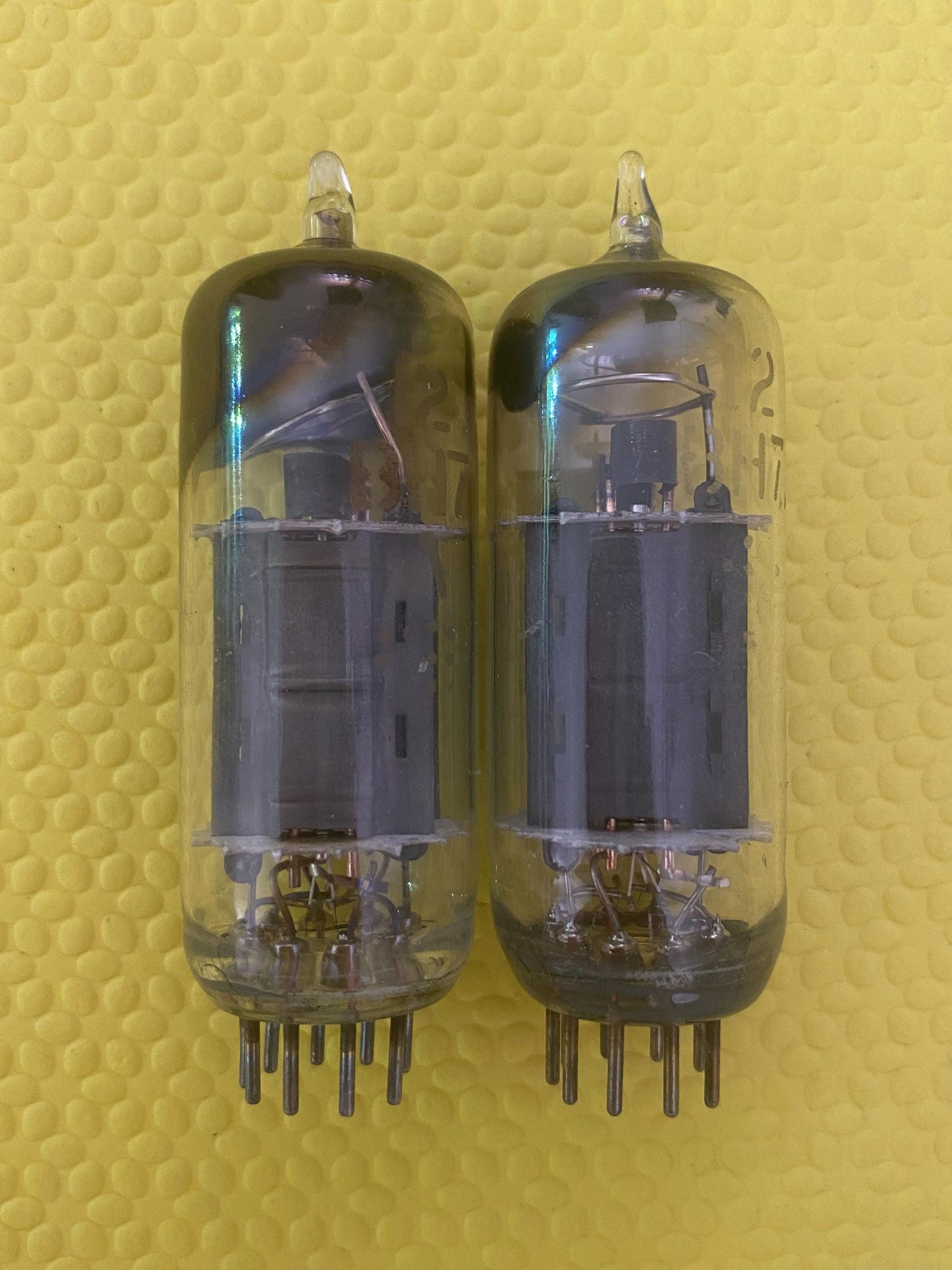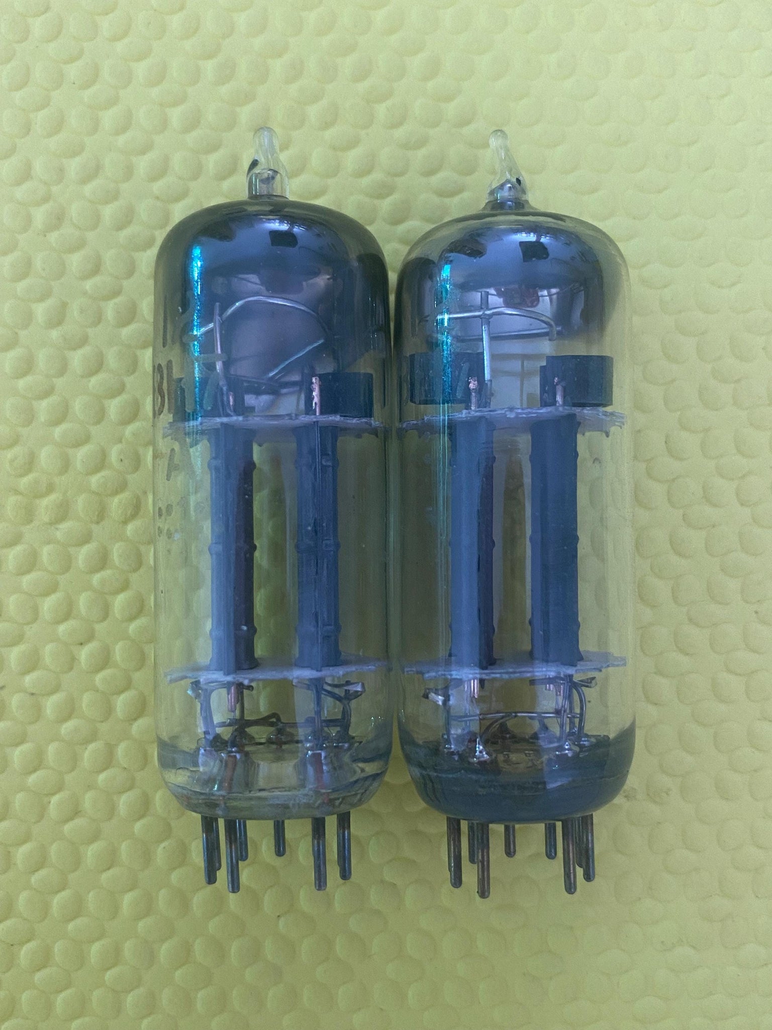 This new old stock-testing matched pair of GE 12BH7A dual triodes was tested on our Paul Hart-calibrated TV7/U for shorts, gas and transconductance. There were no shorts or gas.