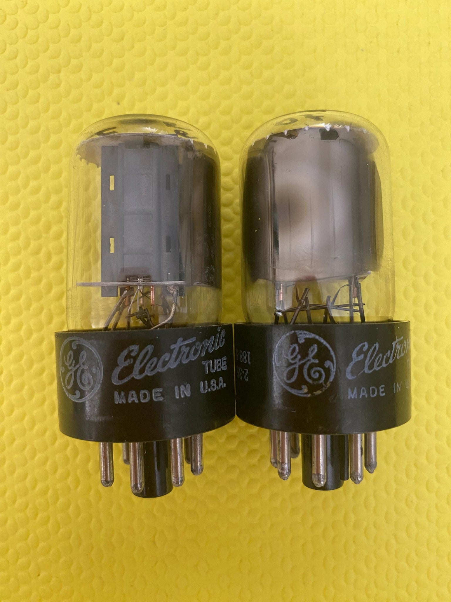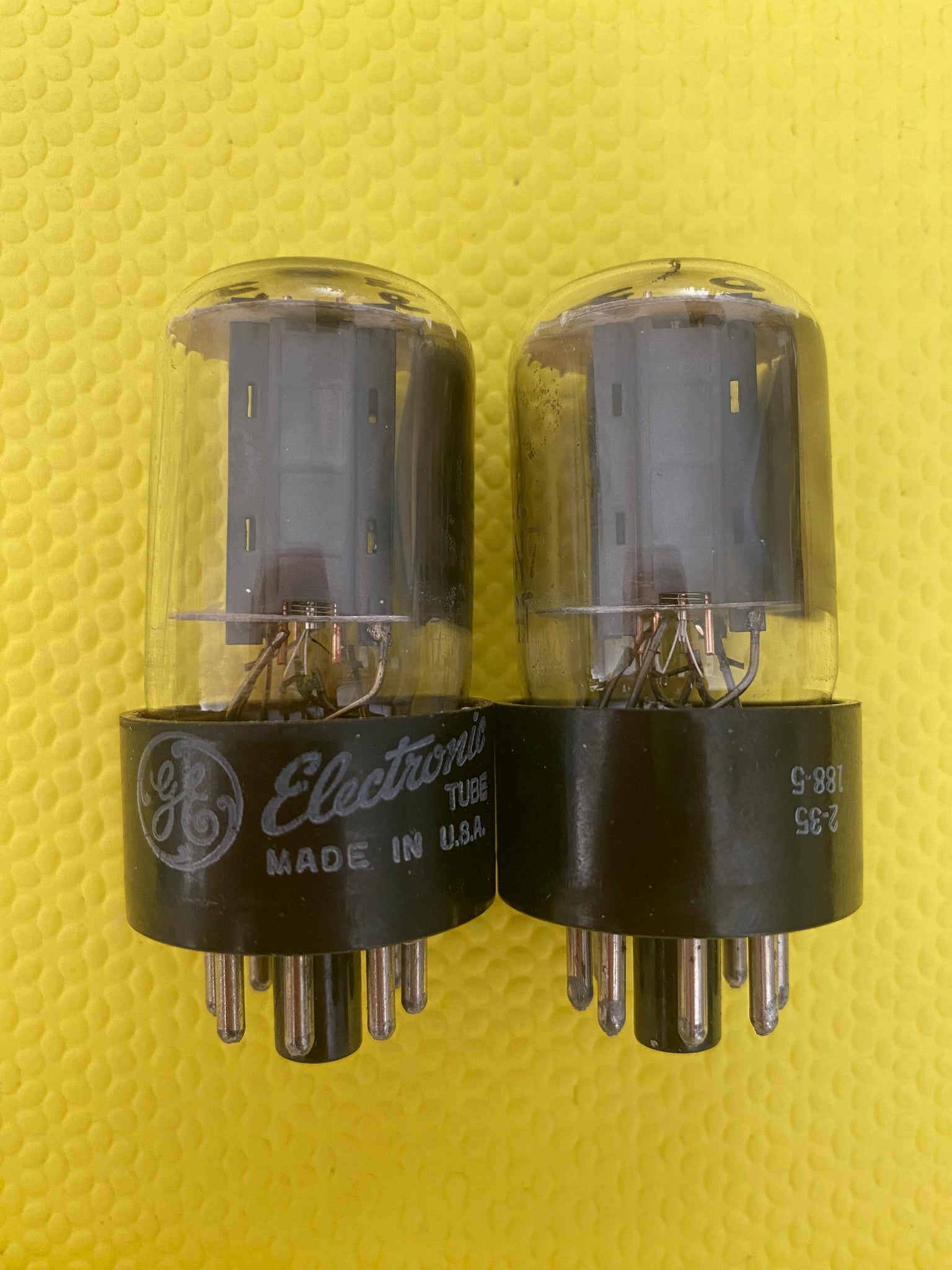 This matched pair of General Electric / GE 12SN7 12SN7GT dual triodes was tested on our Paul Hart-calibrated TV7/U for shorts, gas and transconductance. There were no shorts or gas.