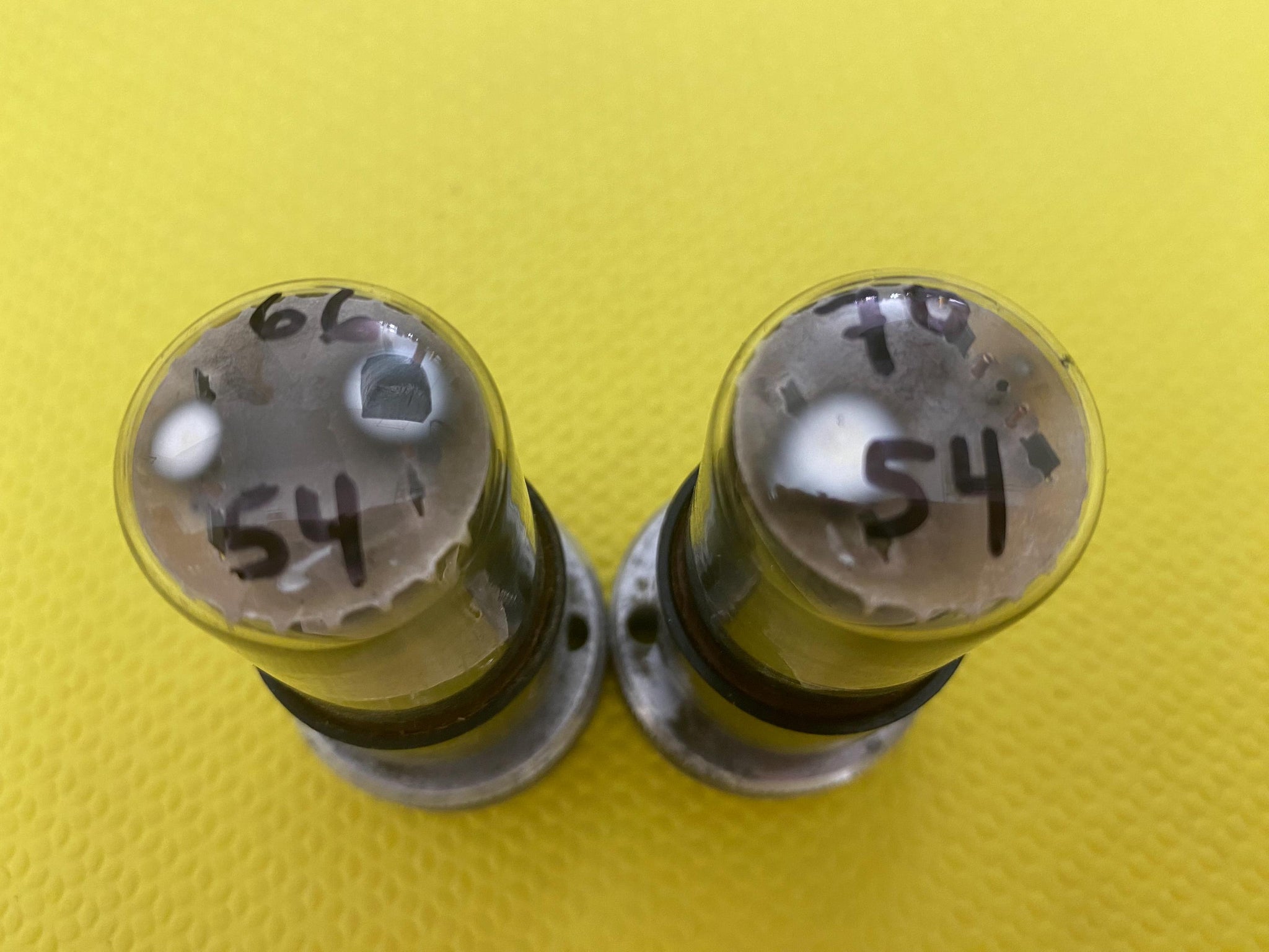 Both tubes have gray, ladder plates; side horseshoe getters; crenelated, gapped, top mica spacers with smooth-sided rectangular bottom mica spacers; copper support rods and great flashing. They have 2-22 188-5 and 2-35 188-5 date codes/EIA code, respectively.