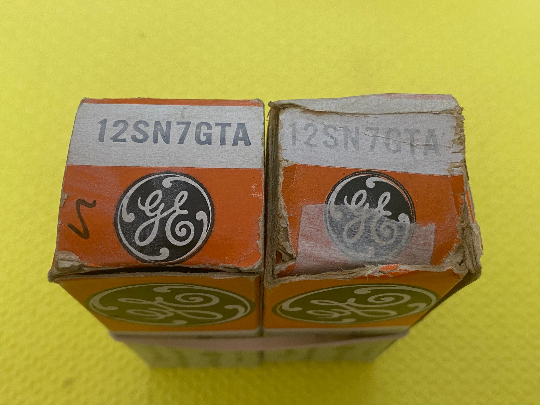 This new old stock, new in box matched pair of GE 12SN7GTA dual triodes was tested on our Paul Hart-calibrated TV7/U for shorts, gas and transconductance. There were no shorts or gas.