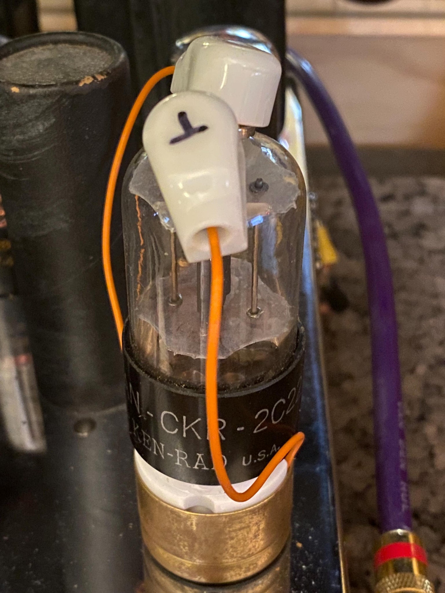 This new old stock, new in box matched pair of Ken-Rad JAN-CKR-2C22 / 7193 milspec triodes was tested on our Paul Hart-calibrated TV7/U for shorts, gas and transconductance. There were no shorts or gas.