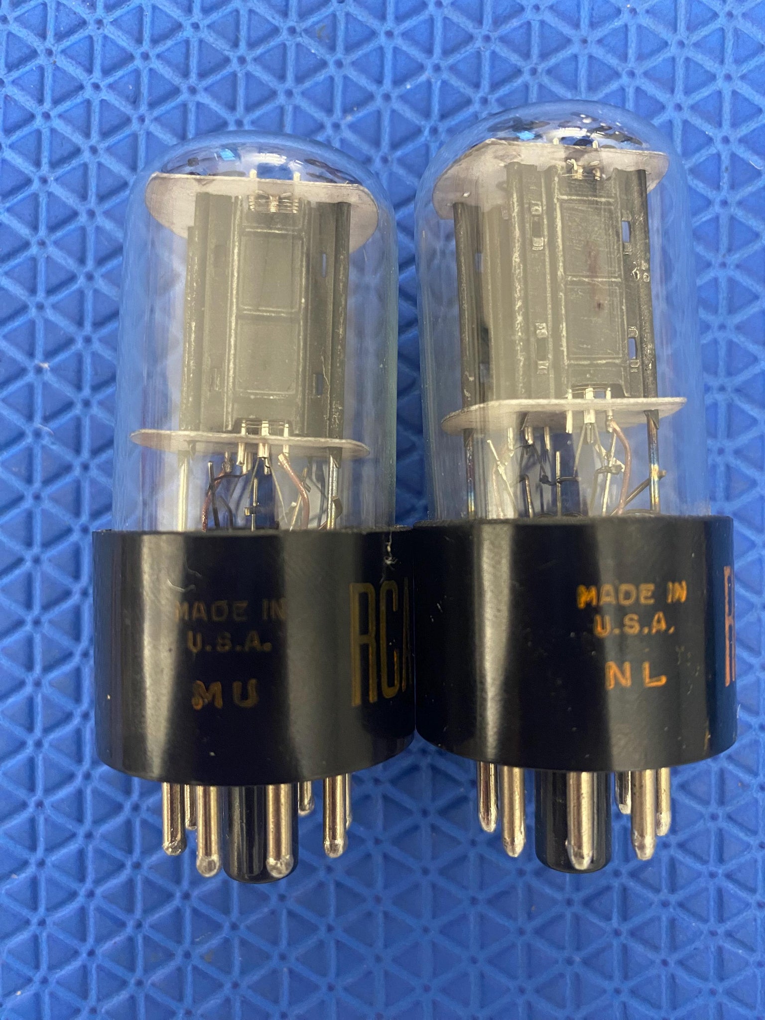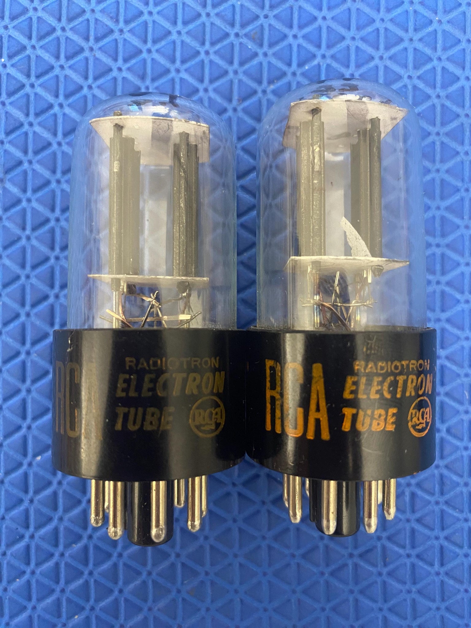 This new old stock-testing matched pair of RCA 12SN7GTB dual triodes was tested on our Paul Hart-calibrated TV7/U for shorts, gas and transconductance. There were no shorts or gas and transconductance measured as follows: