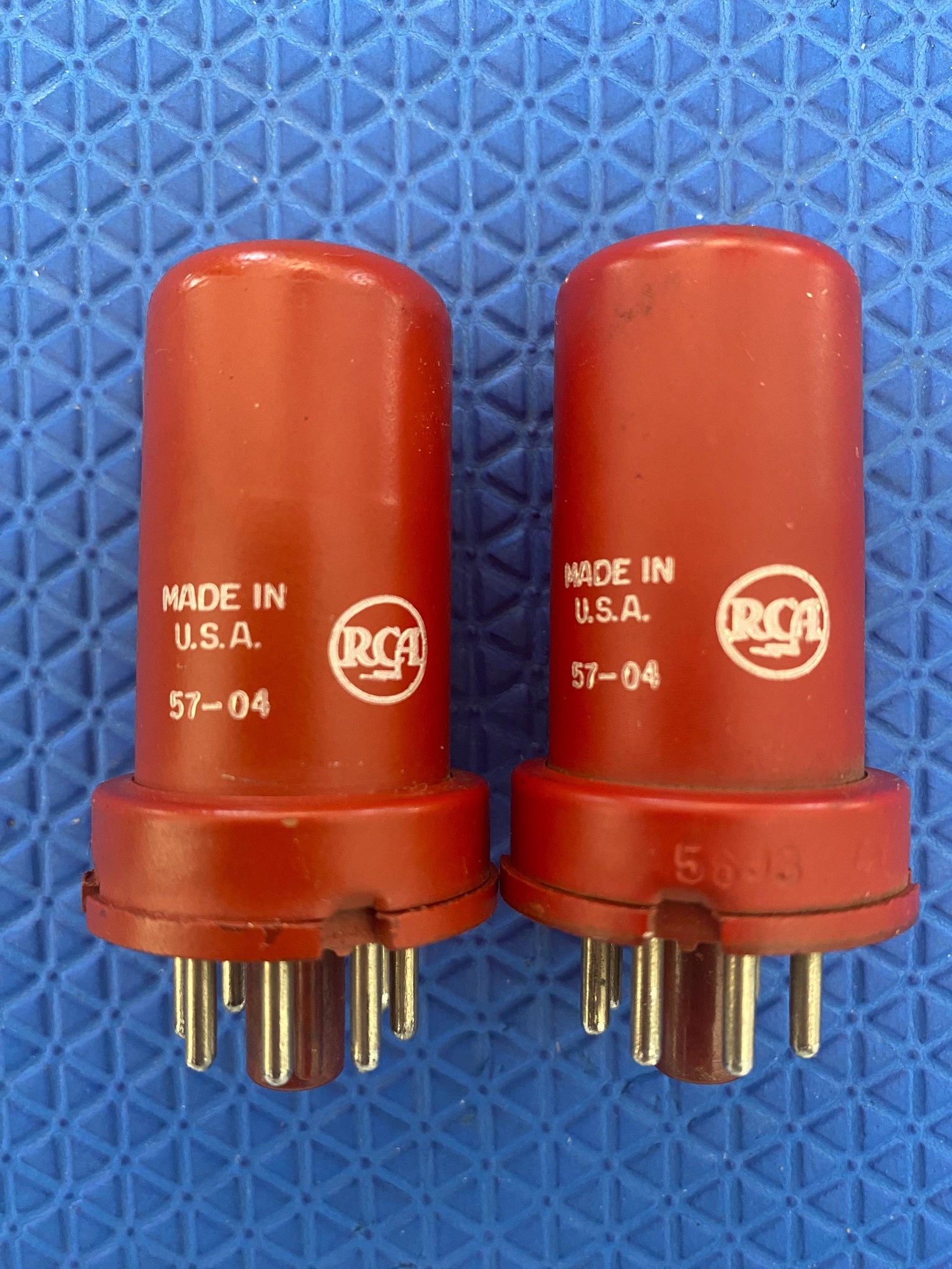 This matched pair of RCA milspec JAN-CRC-5693 / 5693 / 6SJ7s was tested on our Paul Hart-calibrated TV7/U for shorts, gas and transconductance. There were no shorts or gas.