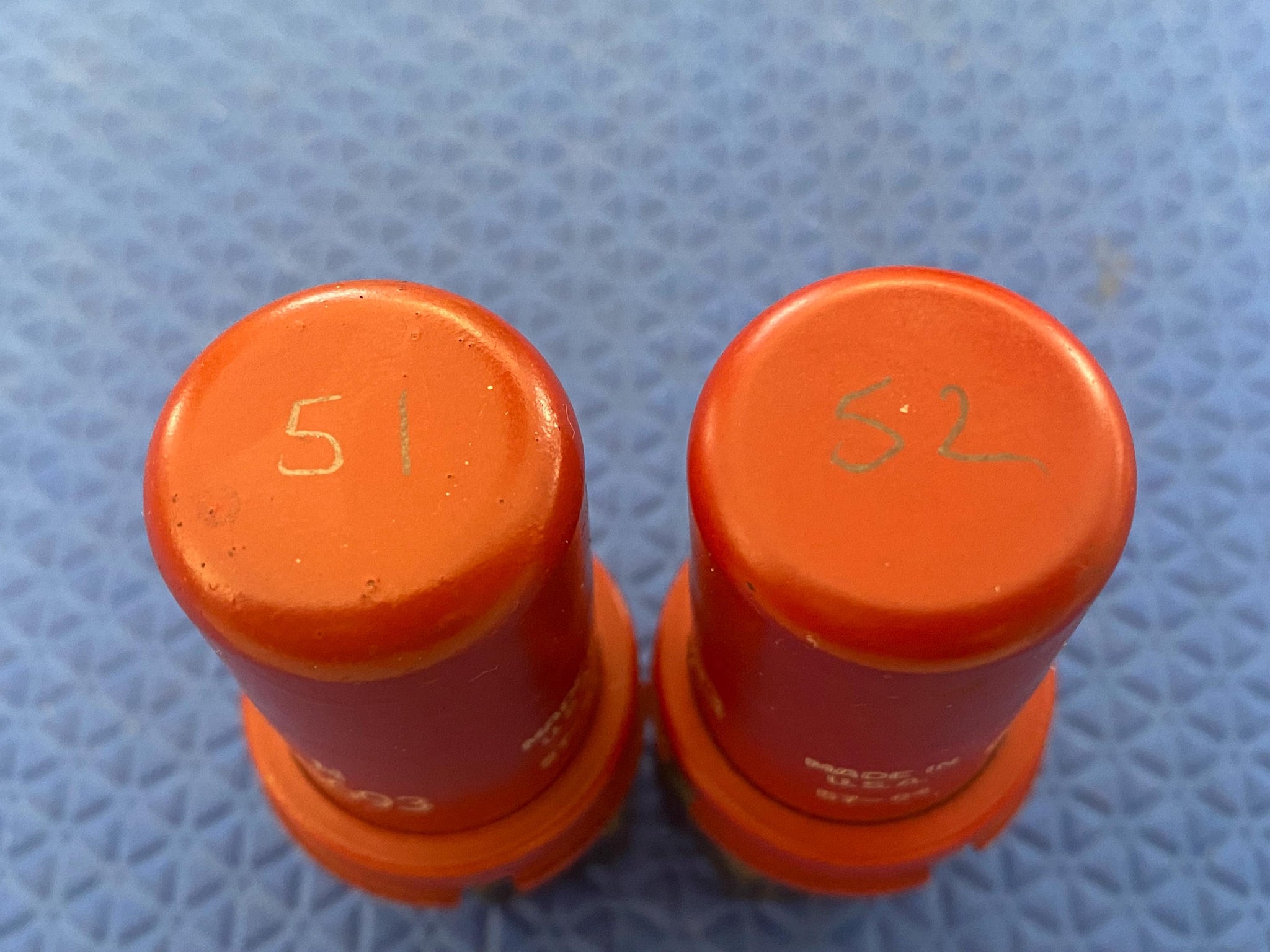 Transconductance measured 51 for Tube One and 52 for Tube Two where minimum (65%) is 40.