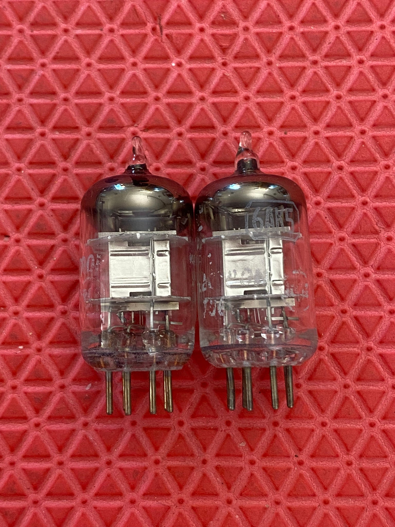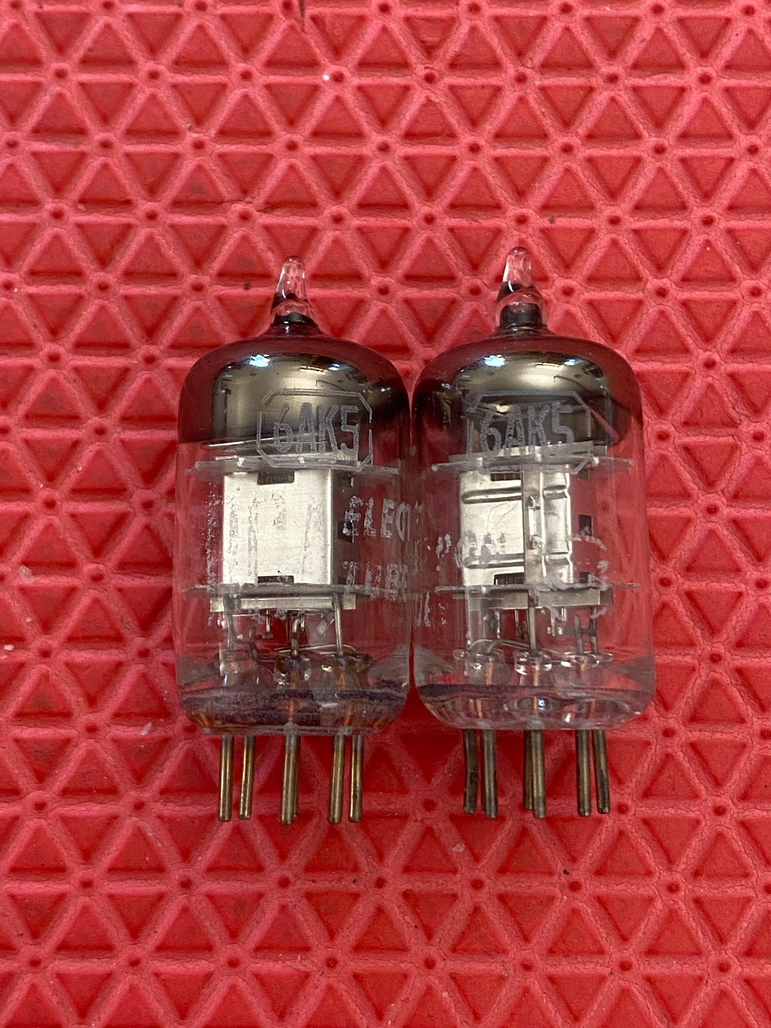 This new old stock, new in box matched pair of RCA steel plate 6AK5 tubes was tested on our Paul Hart-calibrated TV7/U tester for shorts, gas and transconductance. There were no shorts or gas.