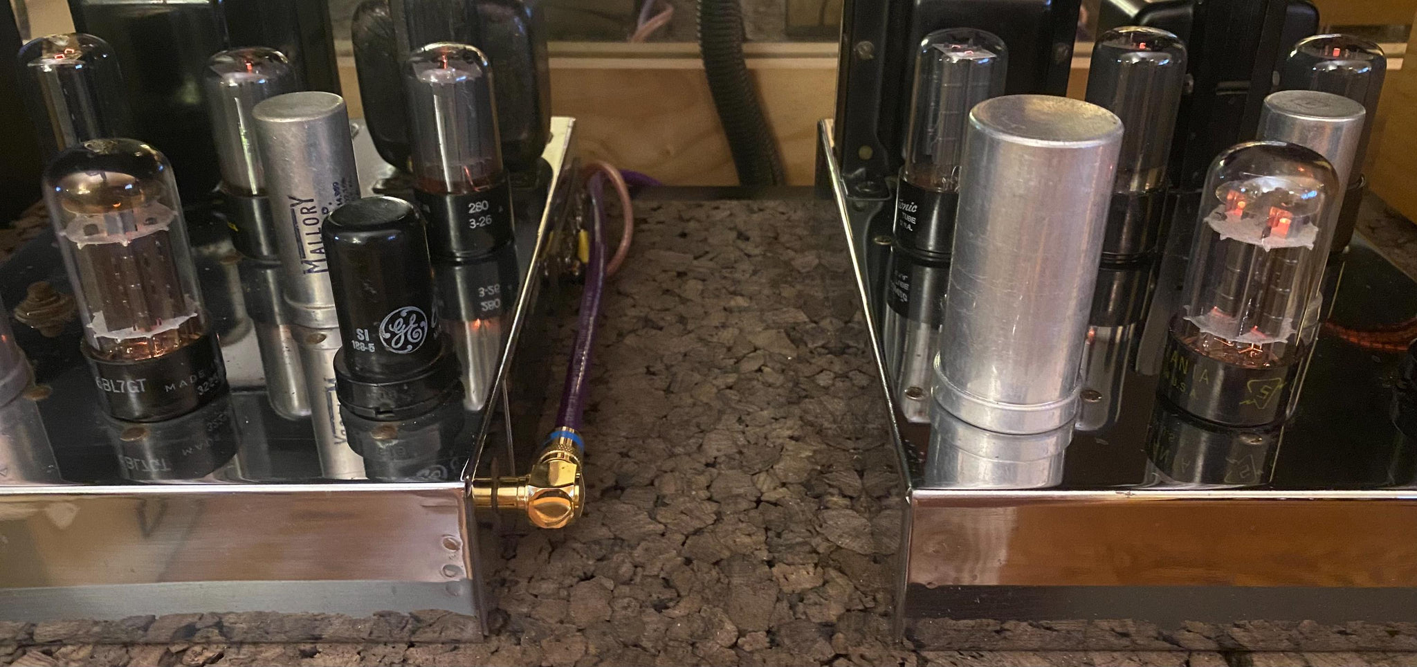 These tubes have copper support rods; beefy black plates: three mica spacers for improved mechanical stability and low microphonics; top D getters and anode radiators for cooler operation and extended life. Tube One has 3225730-3 provenance/date codes.