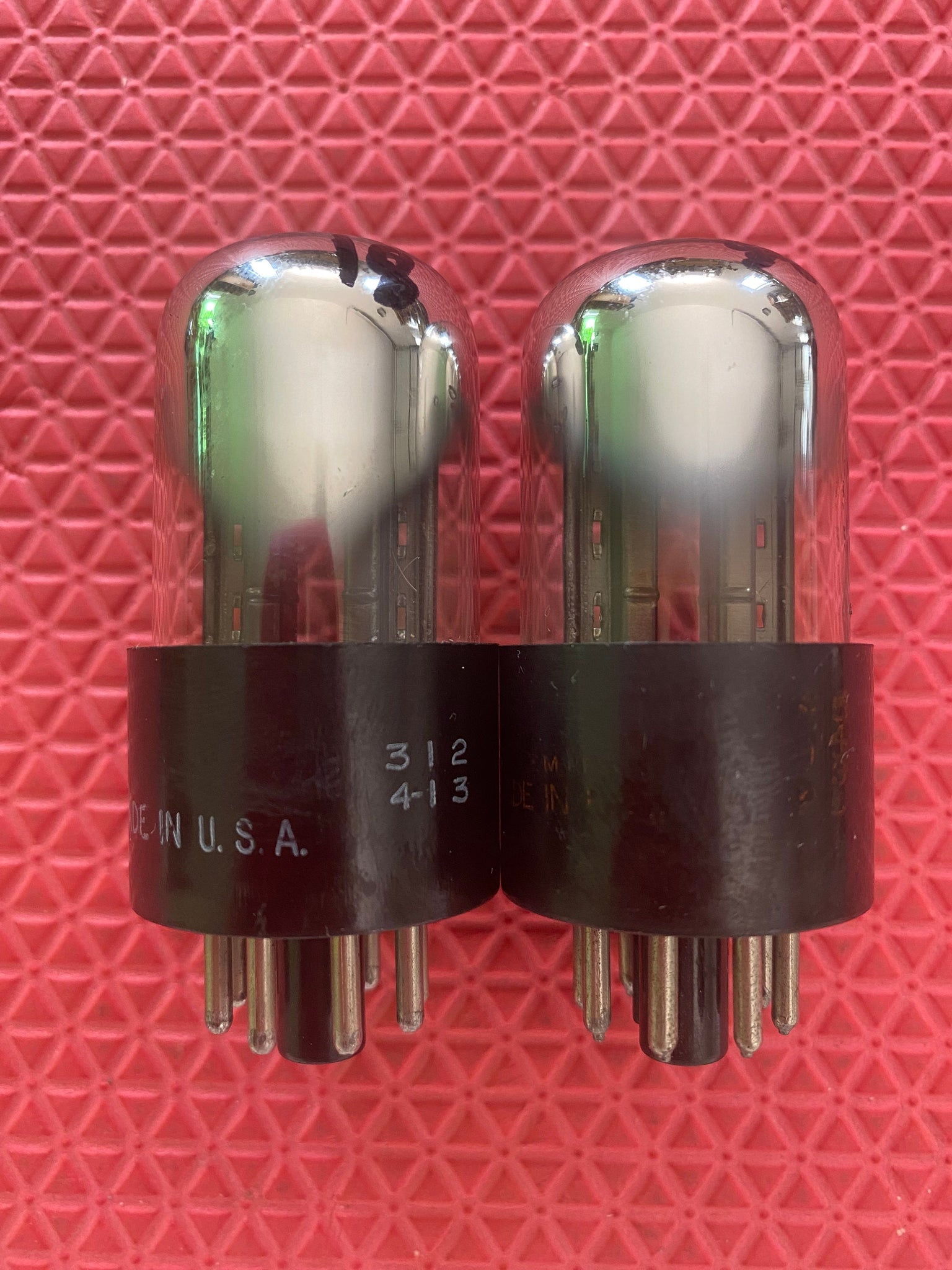 Both tubes have black, three-hole T plates and terrific Sylvania flashing. They have 312 413 and 312 54-35 provenance/date codes, respectively on their bases as well as G1M and F1M batch codes, respectively, on their glass bottles.