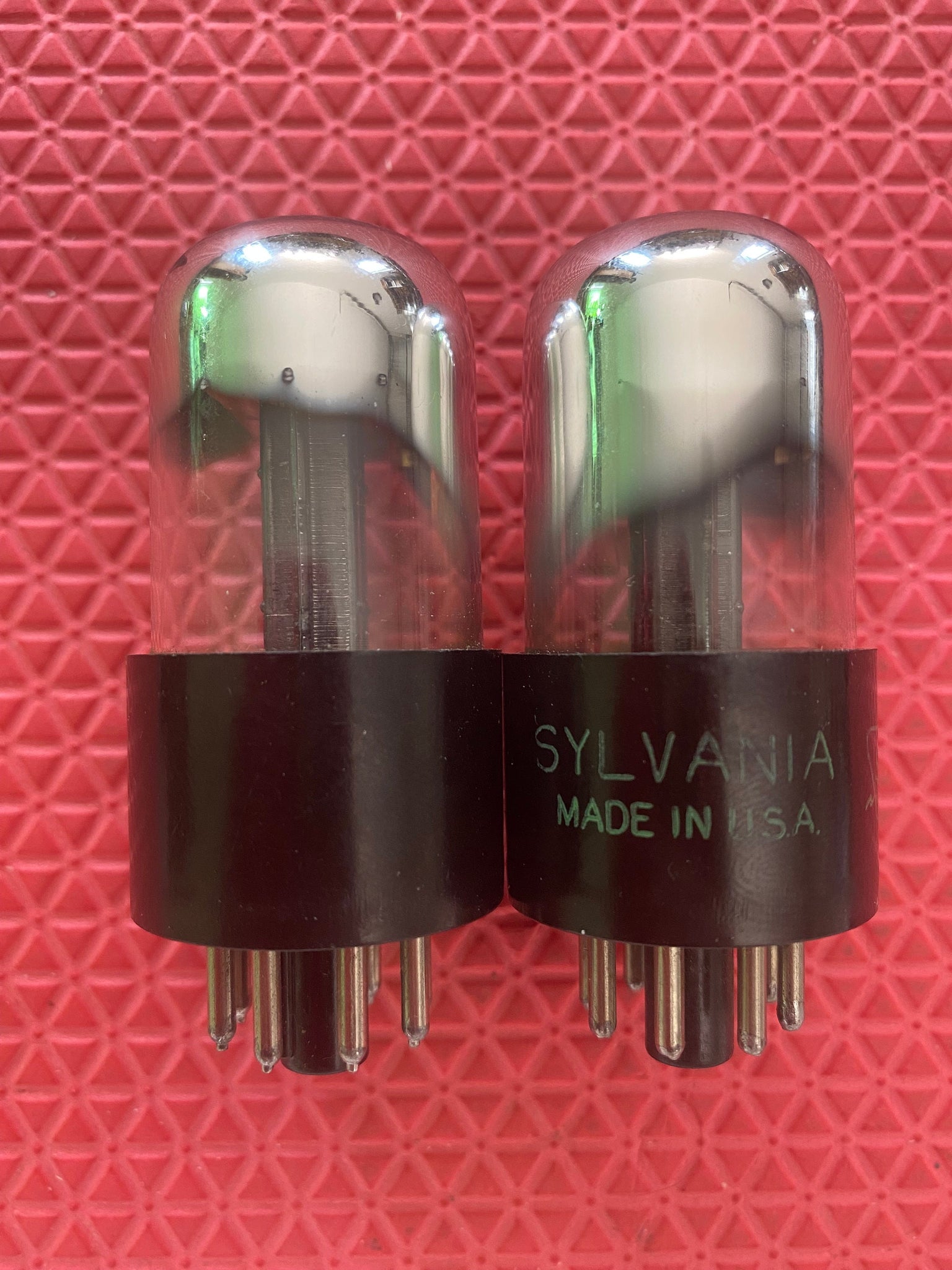 This new old stock-testing matched pair of Sylvania Bad Boy-style (three plate holes per triode) 12SN7GT dual triodes was tested on our Paul Hart-calibrated TV7/U for shorts, gas and transconductance. There were no shorts or gas.