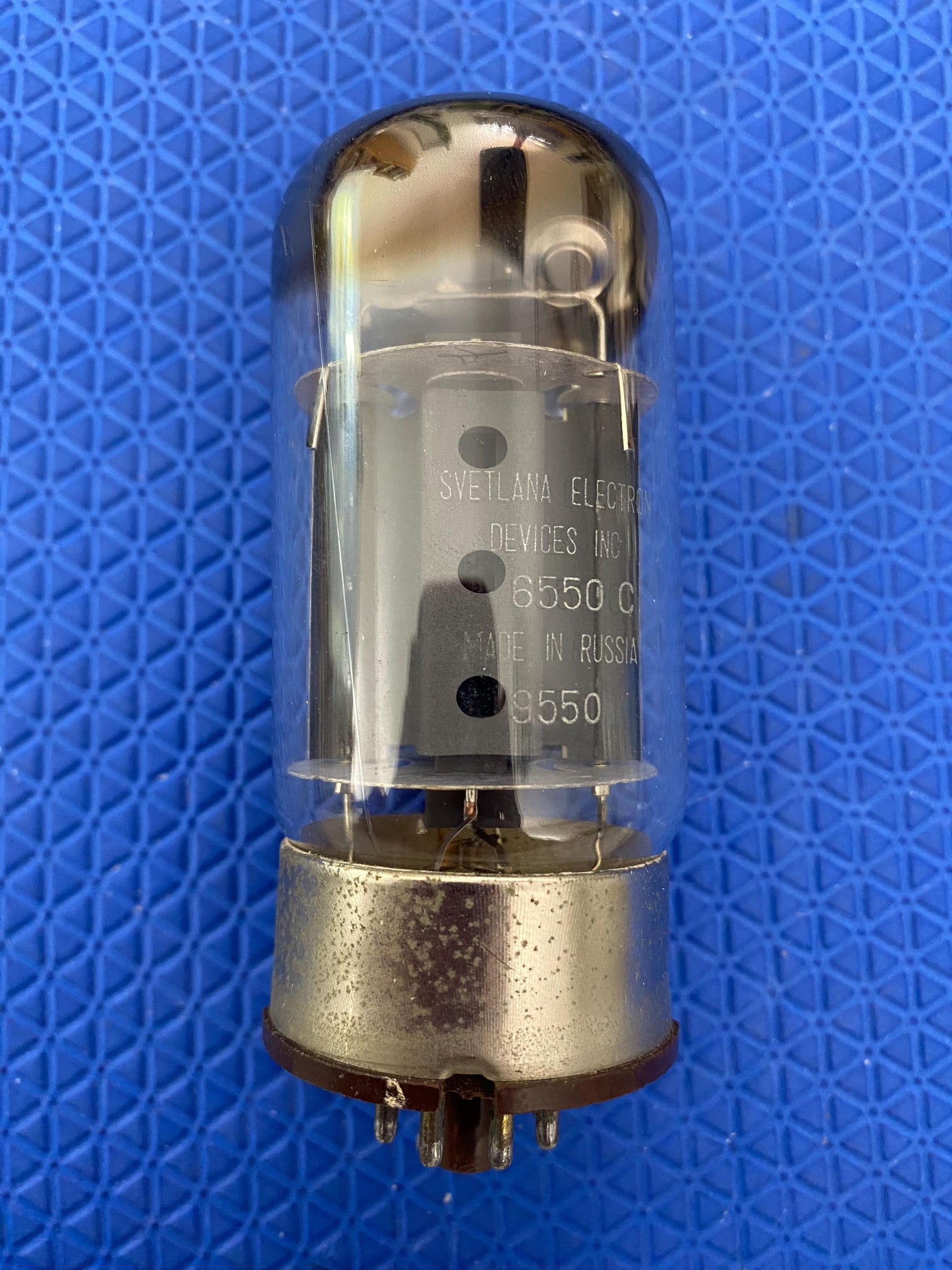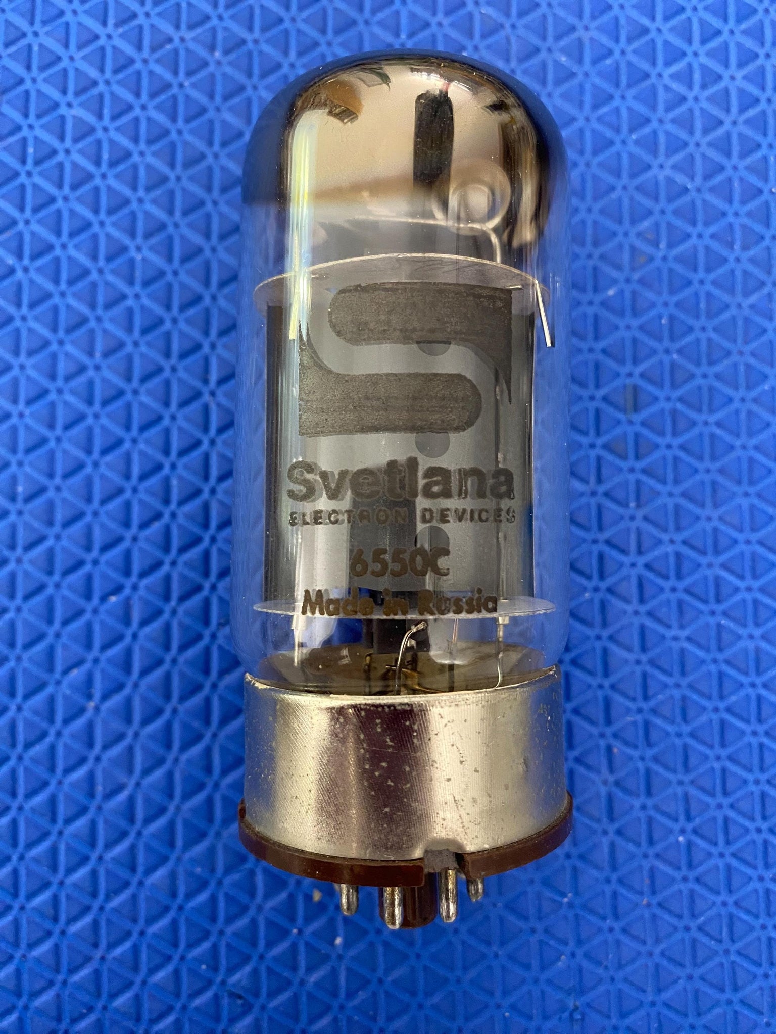 This new old stock-testing Svetlana 6550C / 6P27 perforated plate output tube was tested on our Maxi-Matcher 2 with 400 volts on the plates and a bias of -48 volts for shorts, gas and transconductance. There were no shorts or gas.