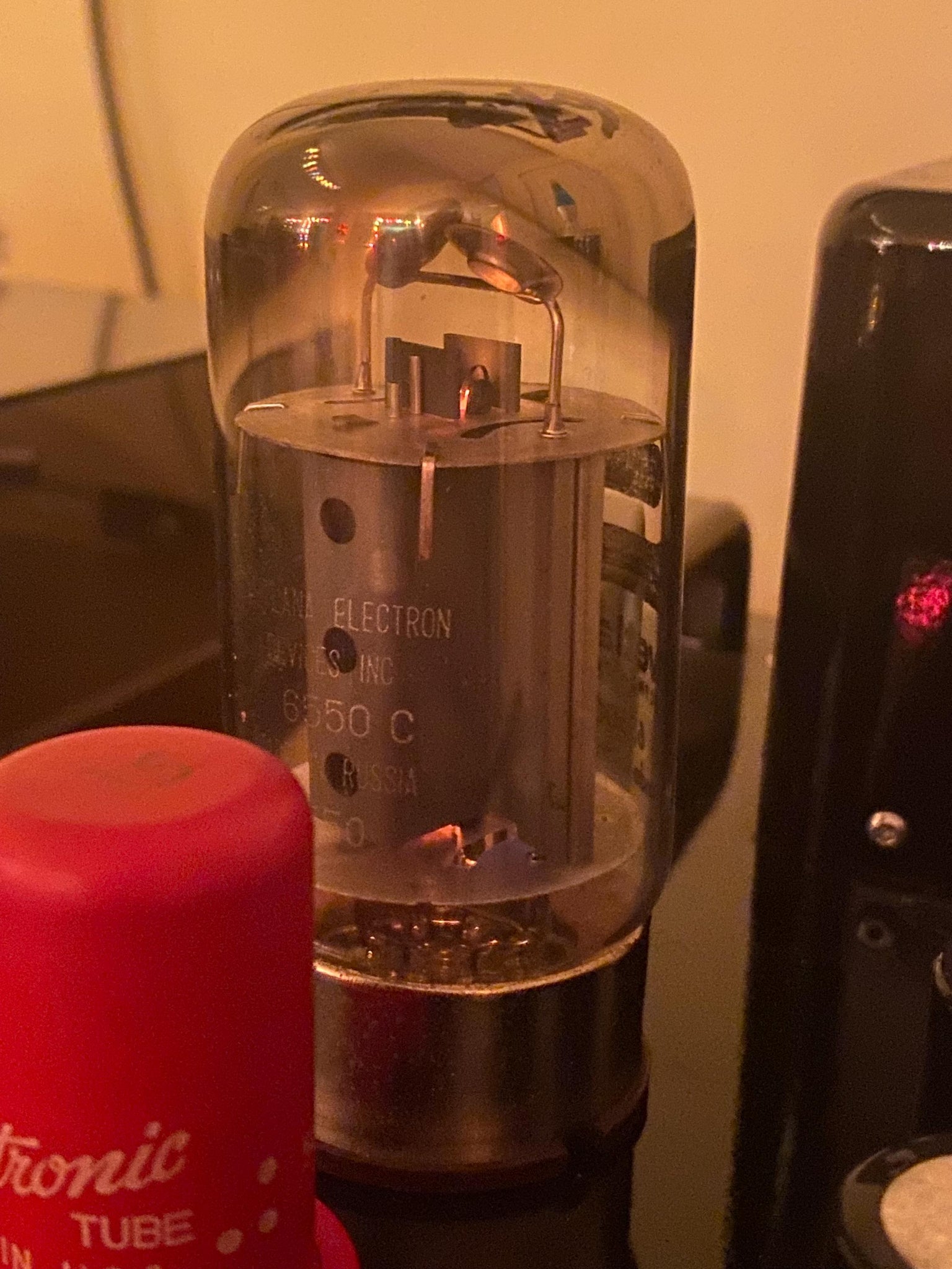 Plate current measured 67.2 milliamps with a transconductance of 5640 micromhos. (New US-made 6550s typically test with plate current from the low 20s to mid 40s with transconductance from 3500 micromhos or so.)