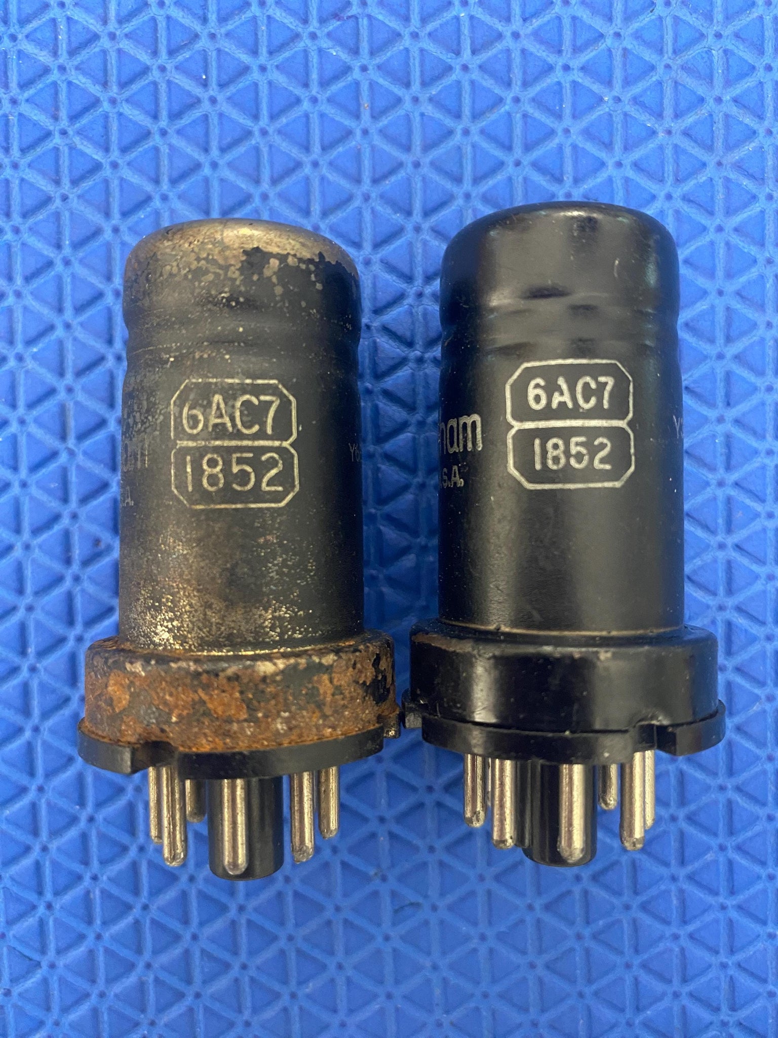 This lot of two Cunningham industrial-grade 1852 (6AC7) tubes was tested on our Paul Hart-calibrated TV7/U for shorts, gas and transconductance. There were no shorts or gas and they measured as follows: