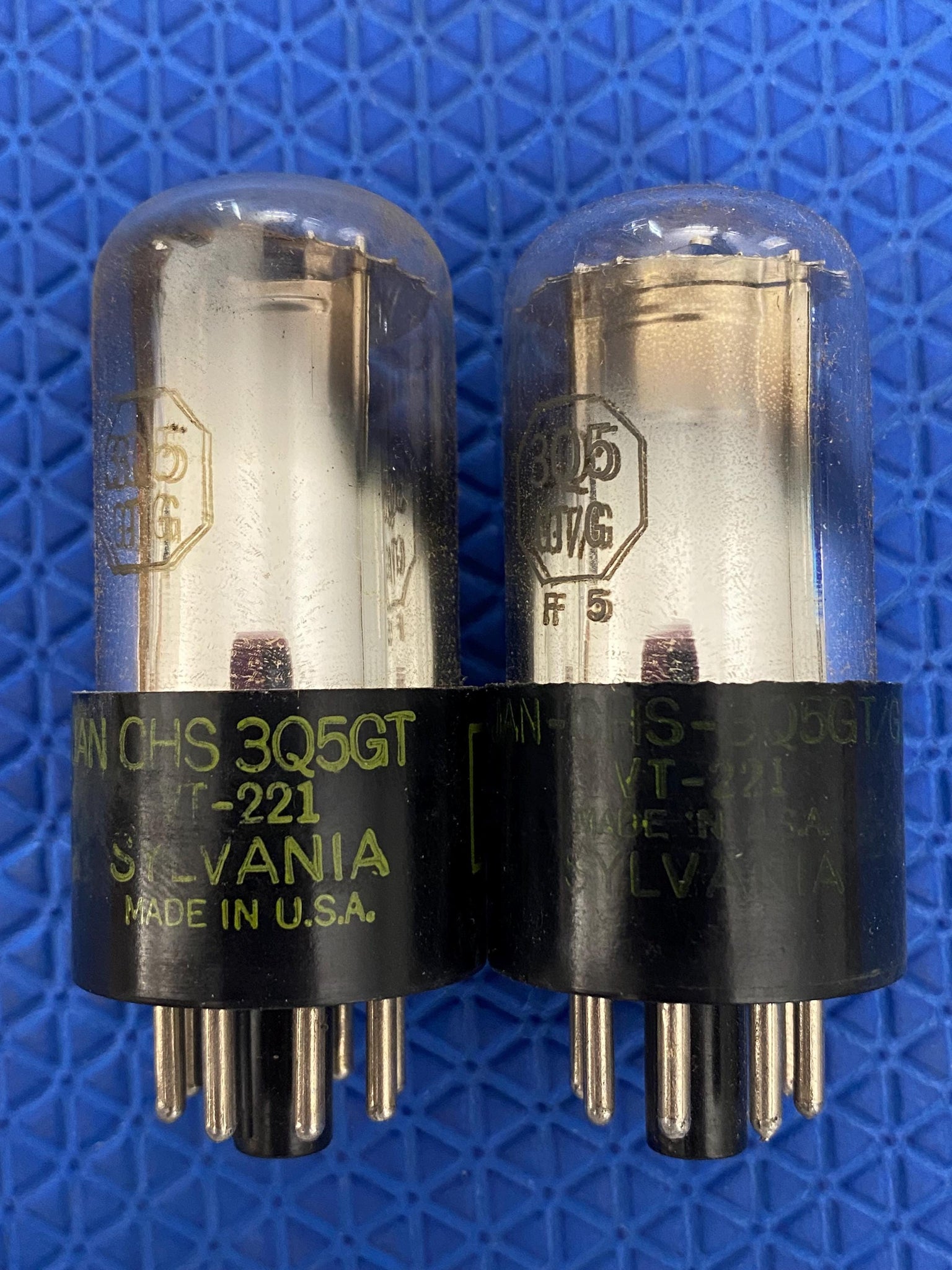 This lot of two new old stock, new in box, milspec Sylvania 3Q5GT / JAN-CHS-3Q5GT / VT-221 tubes tested to spec on our Paul Hart-calibrated TV7/U.