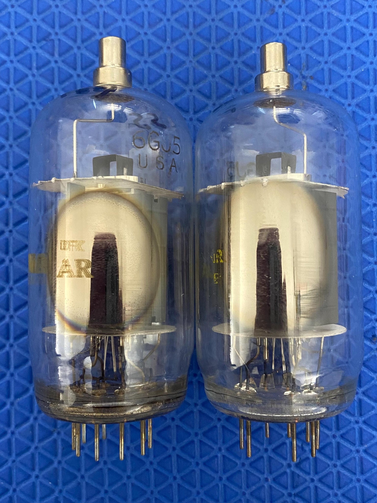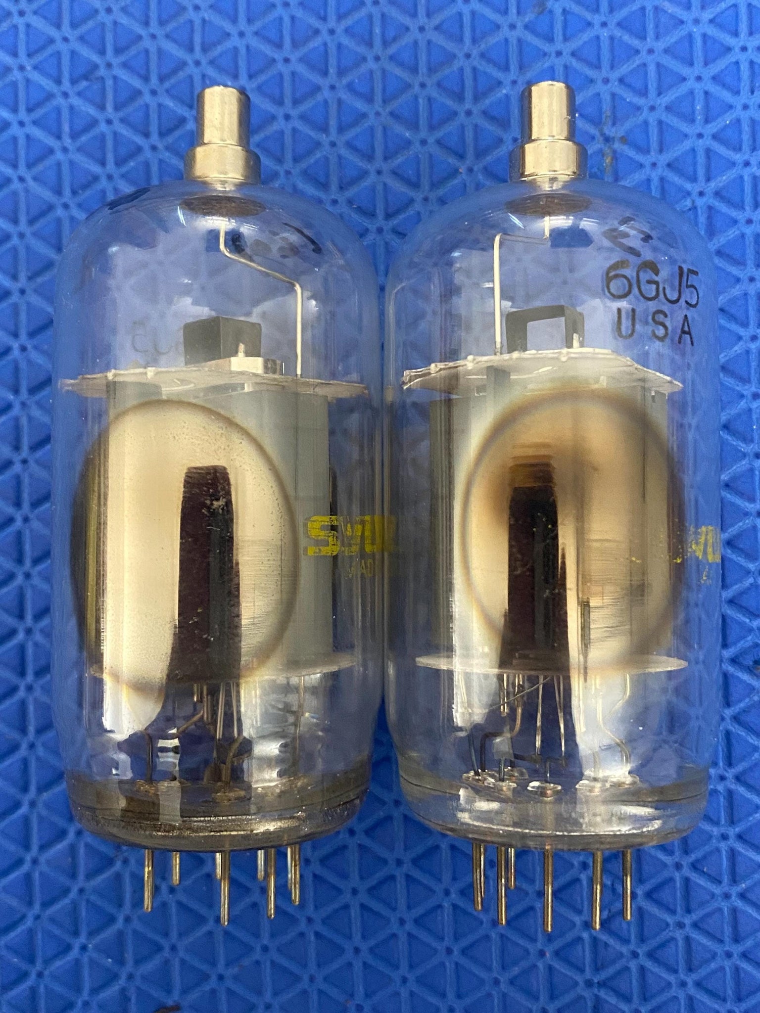 This new-testing lot of two Sylvania 6GJ5A tubes was tested on our Paul Hart-calibrated TV7/U for shorts, gas and transconductance. There were no shorts or gas.