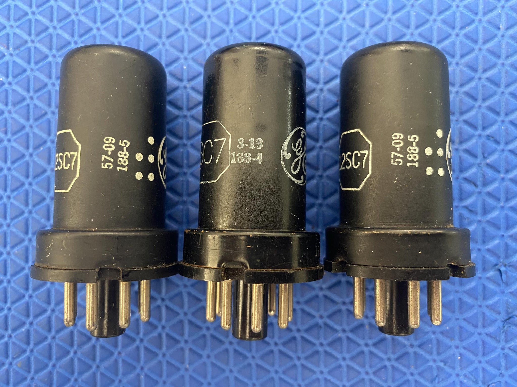 This lot of three GE 12SC7 tubes tested as follows on our Paul Hart-calibrated TV7/U: