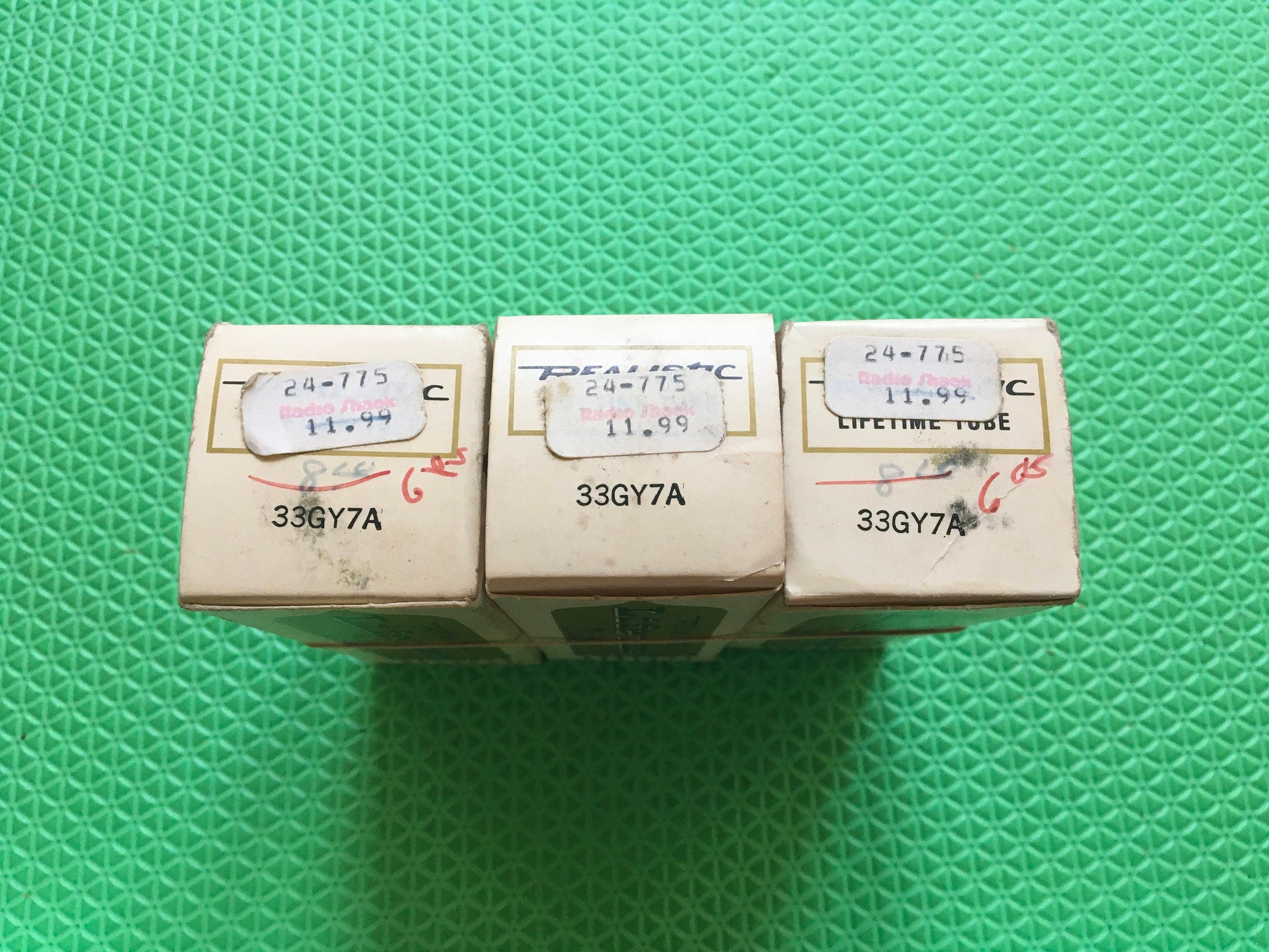 These three new old stock, new in box GE-MANUFACTURED, Realistic-BRANDED 33GY7A tubes tested to spec on our Paul Hart-calibrated TV7/U.