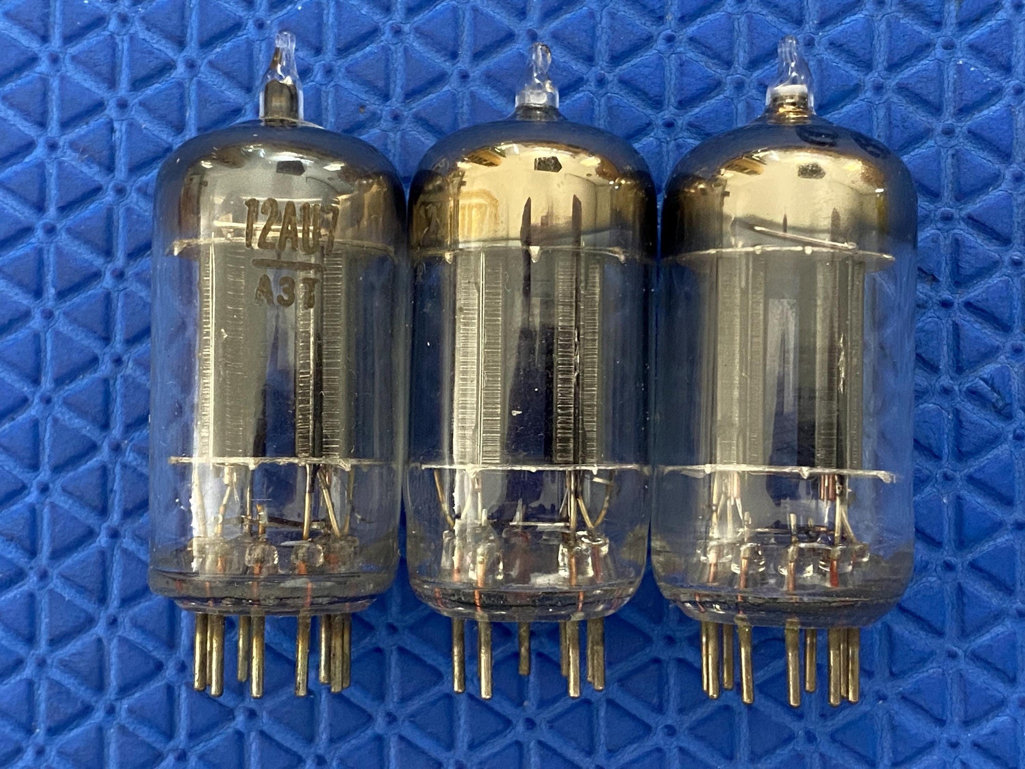 This lot of three Lansdale (Philco's in-house tube manufacturing arm) 12AU7 / ECC82 dual triodes was tested on our Paul Hart-calibrated TV7/U for shorts, gas and transconductance. There were no shorts or gas.