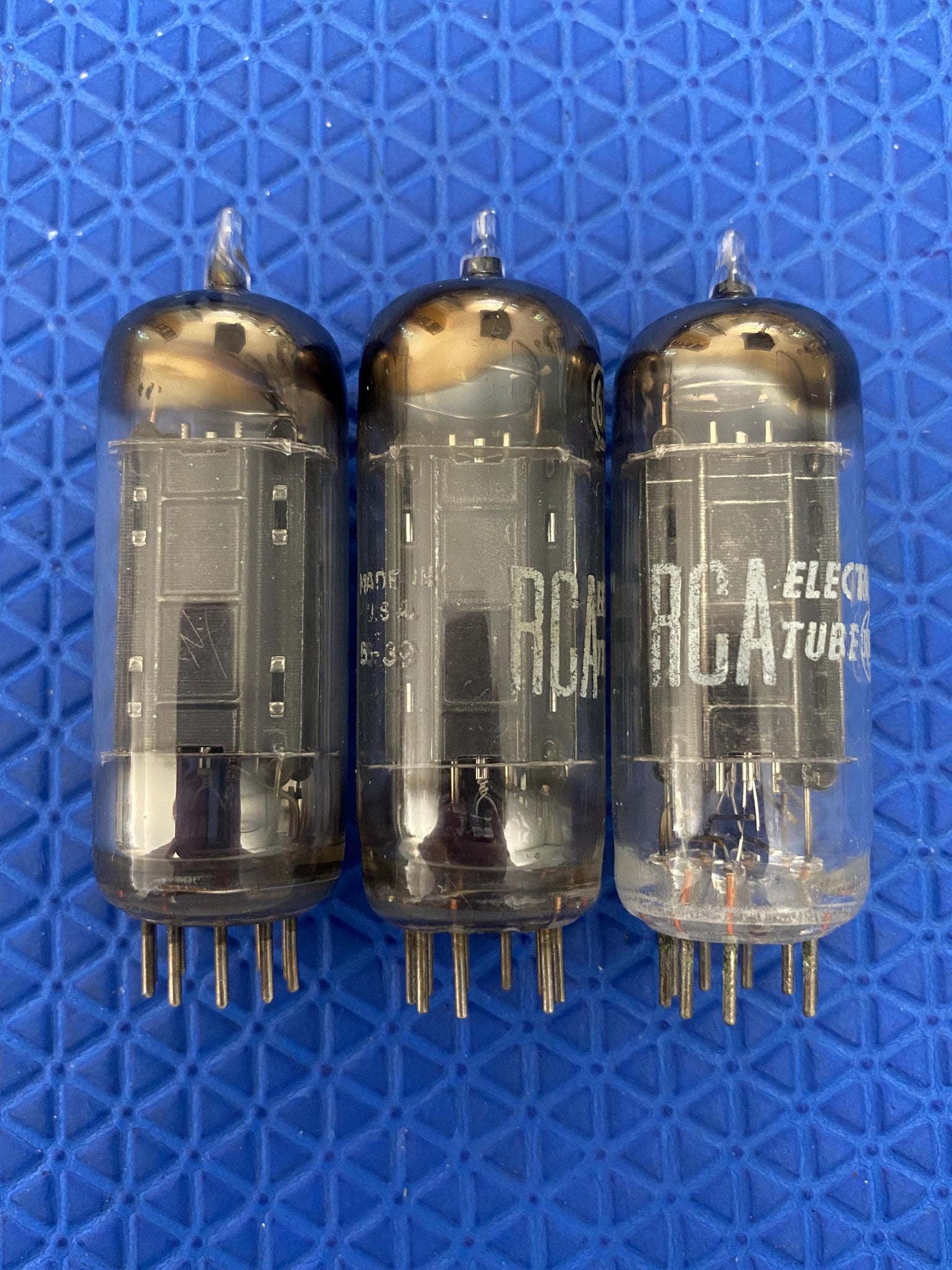 This trio of RCA black plate 6CG7 / 6FQ7 dual triodes was tested on our Paul Hart-calibrated TV7/U for shorts, gas and transconductance. There were no shorts or gas and they measure as follows: