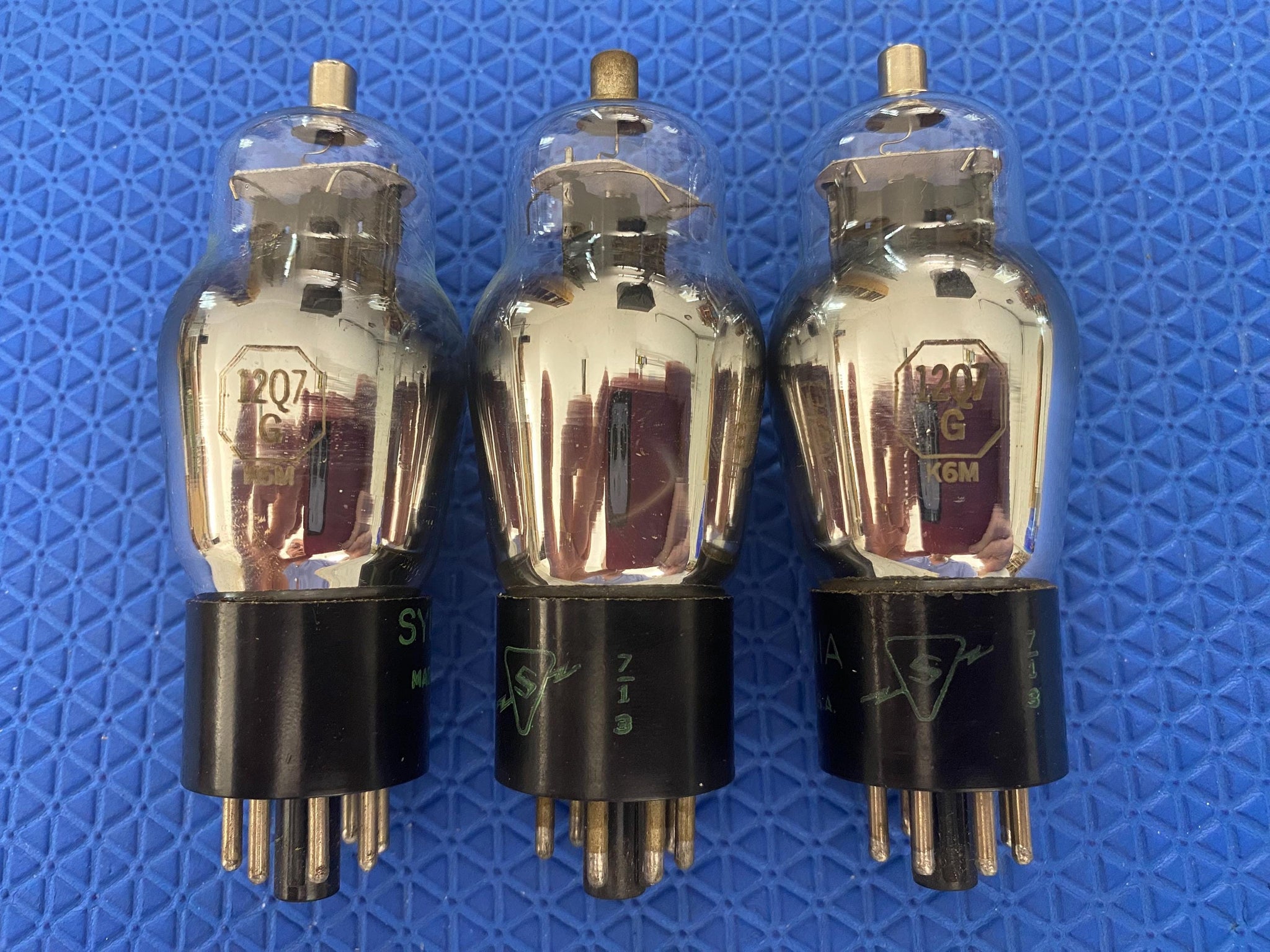 This lot of three Sylvania 12Q7G tubes tested to spec on our Paul Hart-calibrated TV7/U.
